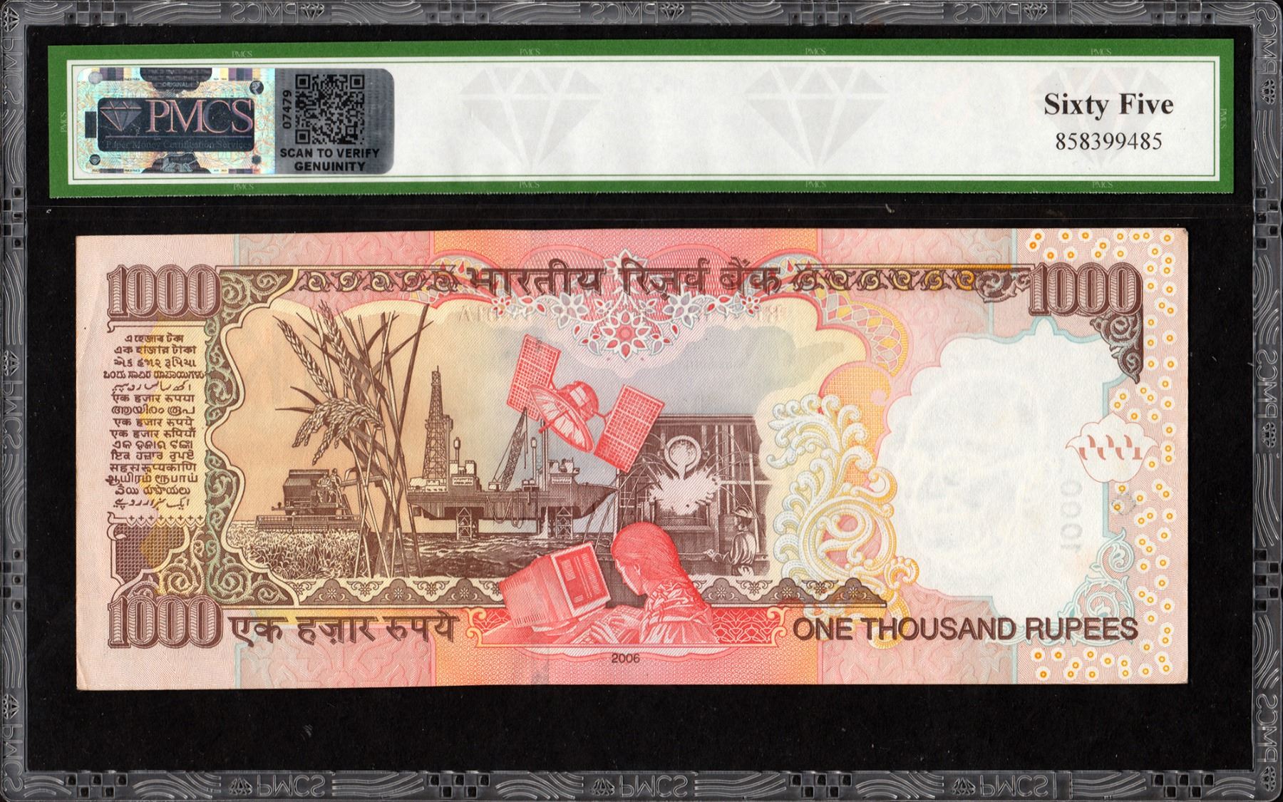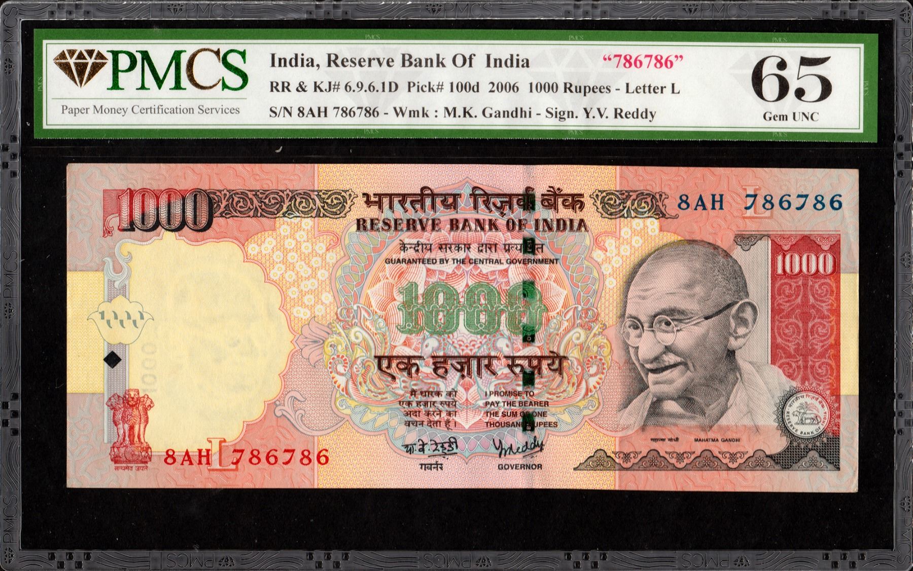 Republic India, 2006, 1000 Rupees, 786786, Fancy Number, Signed by Y.V. Reddy, L Inset, AH Prefix, S. No. 8AH 786786, graded by PMCS as 65 Gem UNC, Extremely Rare.