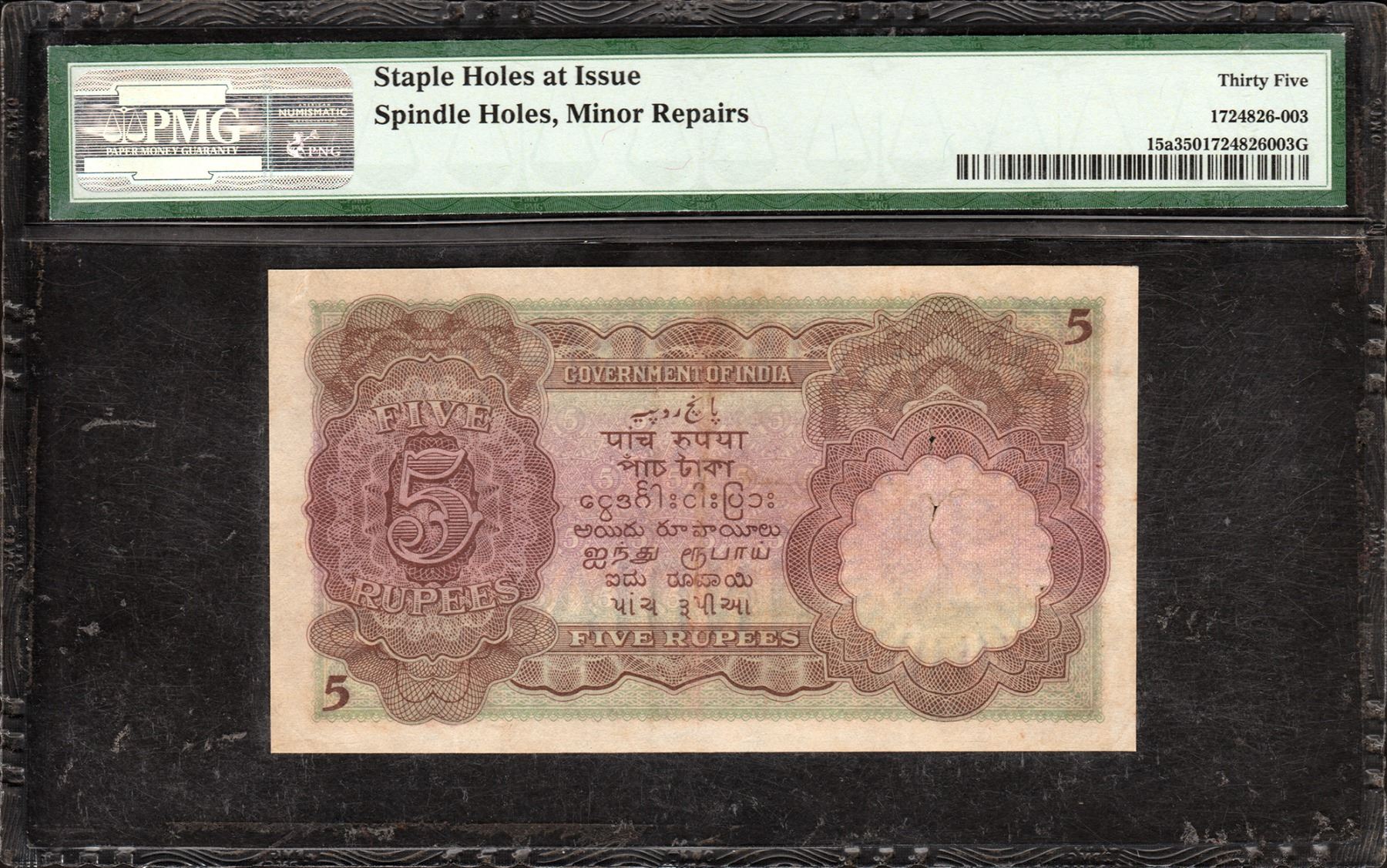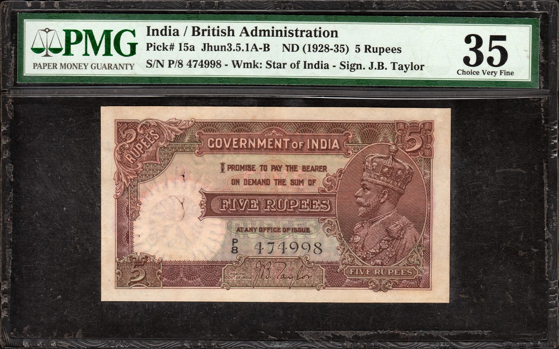 British India, 1933, King George V, 5 Rupees, Signed by J.B. Taylor, P prefix, S. No. P8 474998, printed in Nasik, (KJ & RR # 3.5.1A), staple holes at issue, spindle holes, stains, folds, minor repairs, graded by PMG as 35 Choice Very Fine, Extremely Rare.
