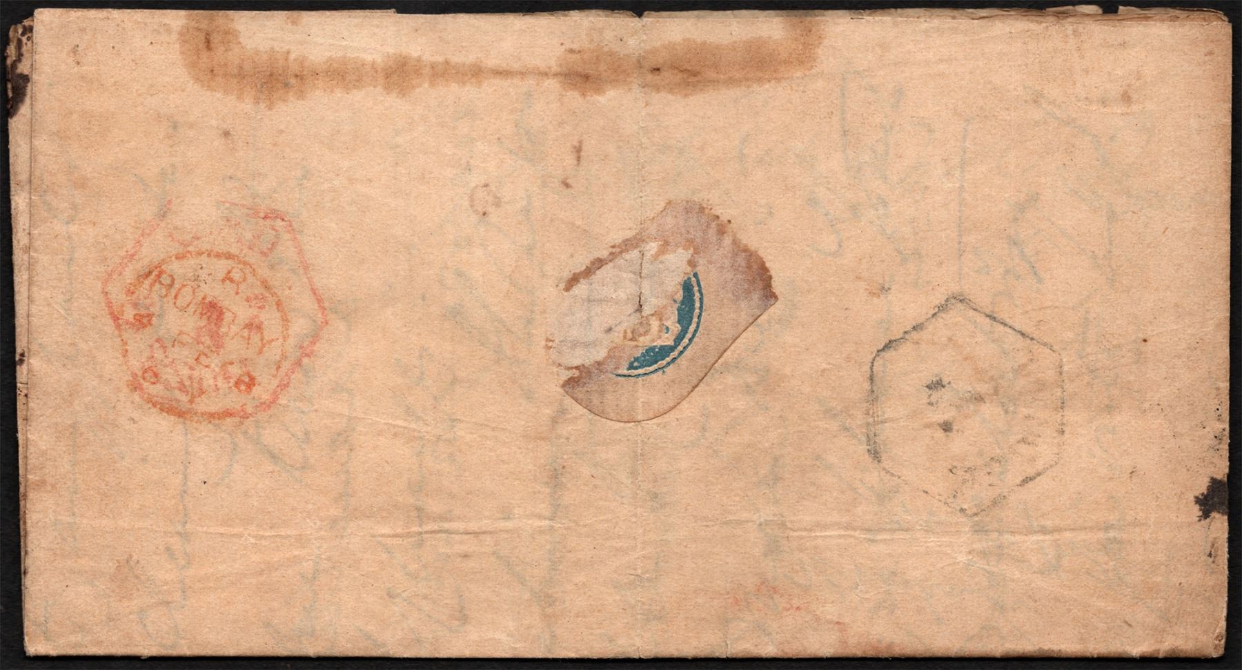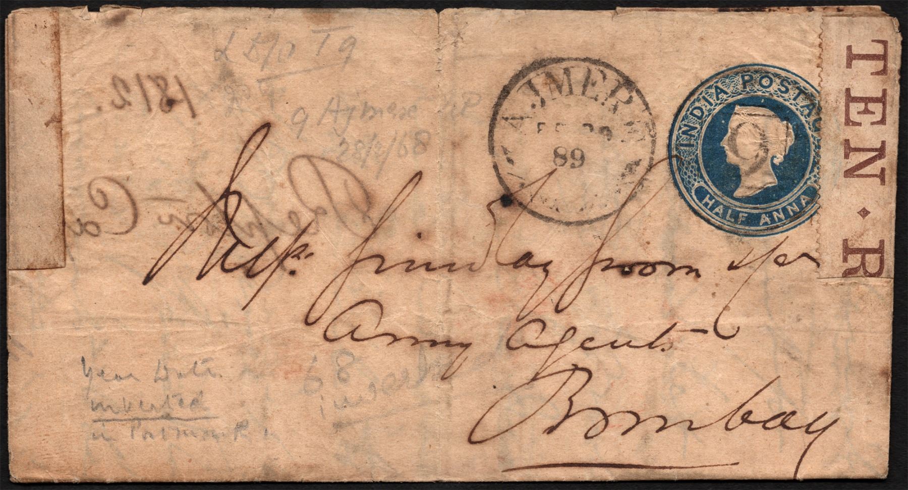 Postal Cover, letter folded as cover, Half Anna, 1868, Queen Victoria, addressed to “ ??? | Army Agents | Bombay”, black round dispatch cancellation with printing error in year (inverted 68) “AJMER | FE 28 | 89” on the front, with many collector’s notes in pencil, and a printed label “TEN ◊ R” on the top right side. On the back side there is a Red hexagonal faded seal overlapped with a round Red delivery seal marked as “R | BOMBAY | 4 FEB 68”, along with a black hexagonal faded seal, very good condition, Very Rare.
