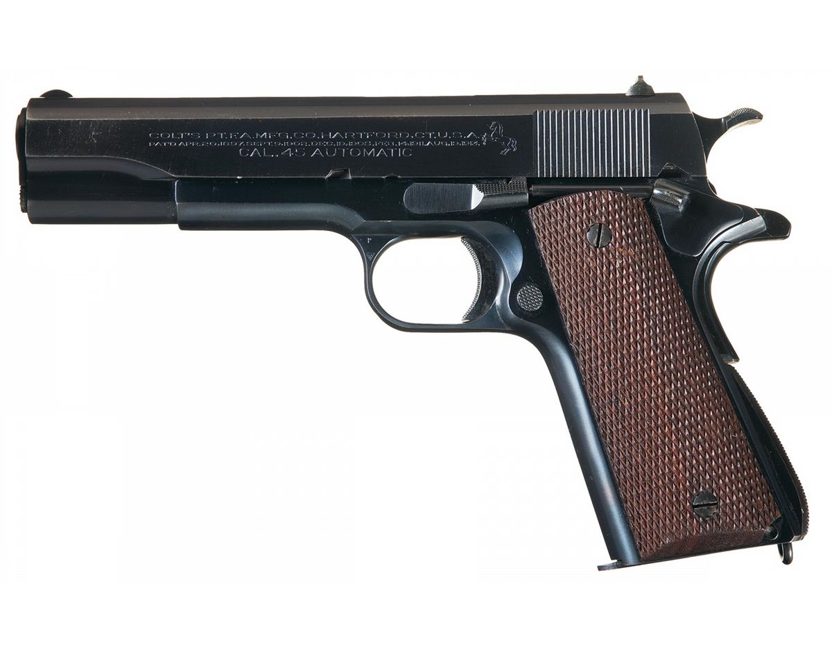 This is a fabulous example of an original Colt Government Model Semi-Automatic Pistol that was manufactured under contract for the country of Brazil. There were approximately 14,500 made in total under this contract in the 1937/38 time frame with very few ever seen in the United States. Eventually the country of Brazil adopted the Model 1911A1 as their standard pistol, and started producing them at the State/Military run IMBEL factory. These pistols conform in all respects to the standard military models manufactured during this time, except they lack the U.S. military proof and acceptance marks. The right side of the frame is marked "GOVERNMENT MODEL/C196230" with the left side trigger guard bow marked with the standard small "P" and Colt "VP" Verified Proof inside a small Triangle, with the right side of trigger bow marked number "77". The left side of the slide has an unusual Colt's three-line markings that consist of the Colt address and patent markings used from 1937-40, with an additional marking below that of "CAL .45 AUTOMATIC", obviously intended to alert the user that this was a nonstandard caliber. The right side of the slide has the single Brazilian country/military crest with the following in two lines "EXERCITO BRASILEIRO No5620/1937. The slide is correctly numbered (196/230) above and below the firing pin stop plate. The pistol has the standard checkered trigger, arched mainspring housing, thumb safety and slide stop and it is fitted with a set of checkered walnut grips. The blue barrel has a polished chamber area and is marked on the left side "COLT 45 AUTO". It is complete with one half-tone blue magazine that is marked "COLT/45 AUTO" on the bottom of the base plate.