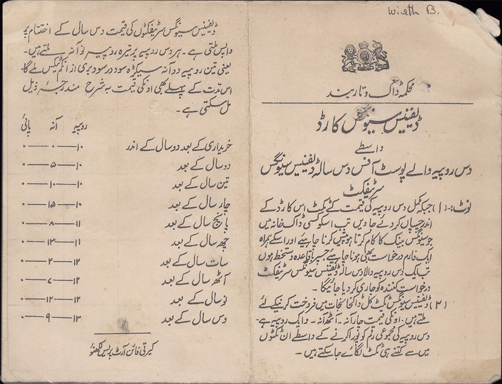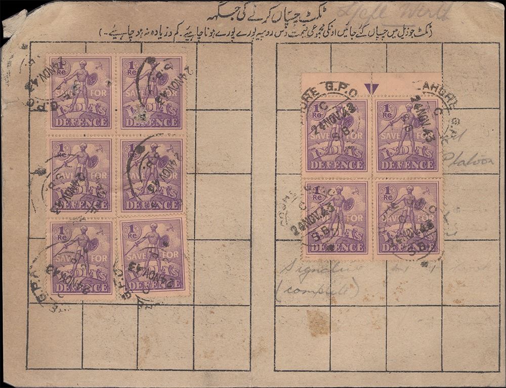 Save for Indias Defence, 1943,Tied up 1Re X 10 Stamps as Saving, 1 Block of Four with Upper side margin 1 Block of Six, Post office Saving Certificate, Printed in URDU, Cancelled Seal 24 NOV 43, Lahore,Printed in Lucknow,Rare.