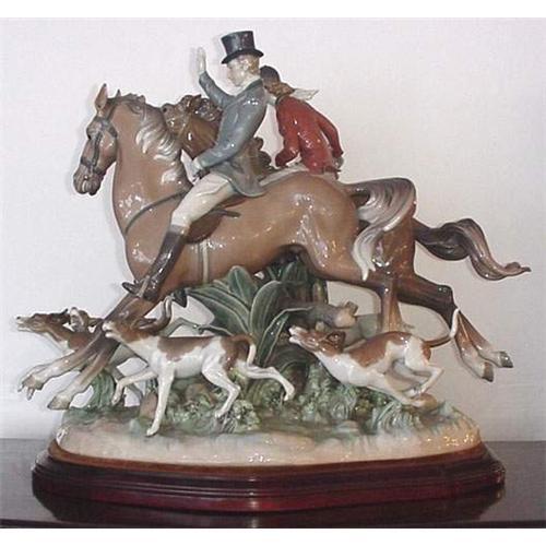 Extremely Rare Retired Lladro Hunting Sculpture by Salvador Furió. Year of introduction: 1974. Year of retirement: 1984. Only 750 of this pieces was made between this ten years. A truly masterpiece with marvellous colours and very vivid movements. Mounted on a wooden base with the Gilded 'Lladro' plaque. This amazing porcelain sculpture is good enough for the very best of collections and deserves to find its place in one of them.
