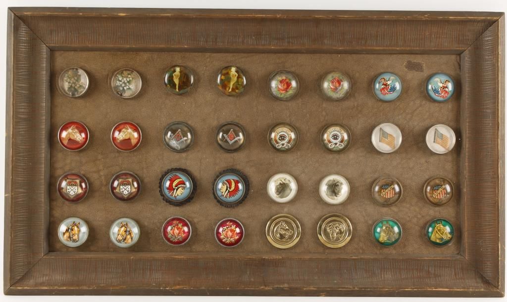 (16) pairs. With a pair of rare Betty Boop 1920's rosettes, a pair of Indian Chief rosettes, American flags, horses, WMA, floral, mason, and the I.O.O.F., and many others. All mounted on board and framed. All pairs are original and show age.