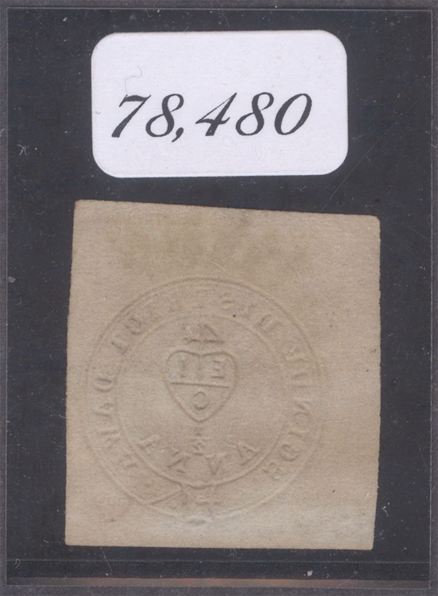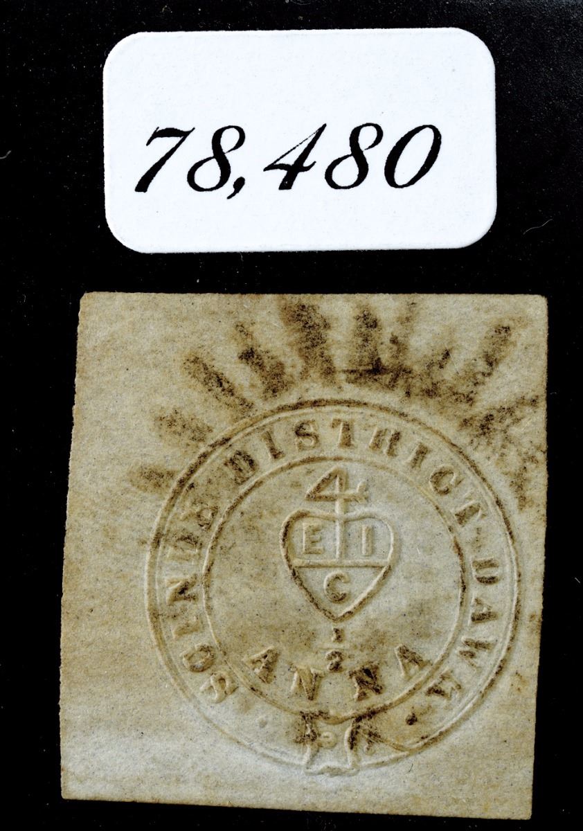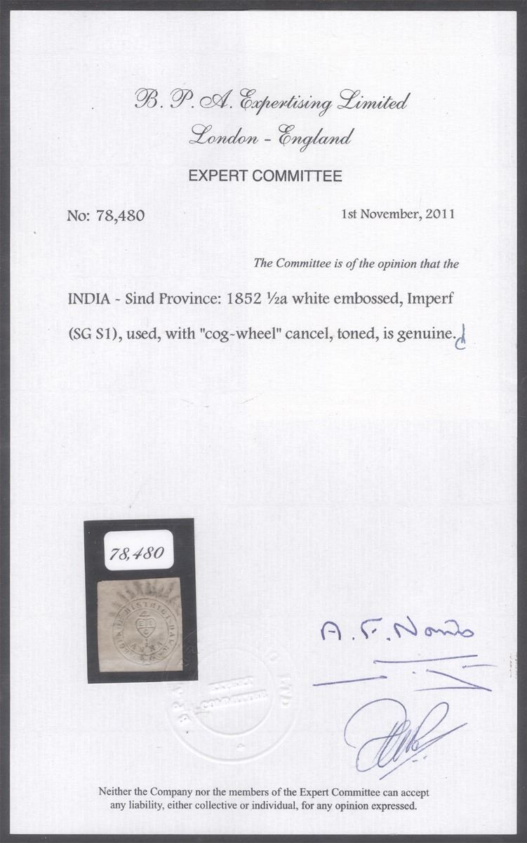 Scinde Dawk, 1852, 1/2 Anna, WHITE,LargeSunburstCancellation,CertifiedByBPA expertizing limited, London, Certificate No. 78480, dated 1st Nov 2011, USED, Very Light Cancellation,SG # 1, Extremely Rare.