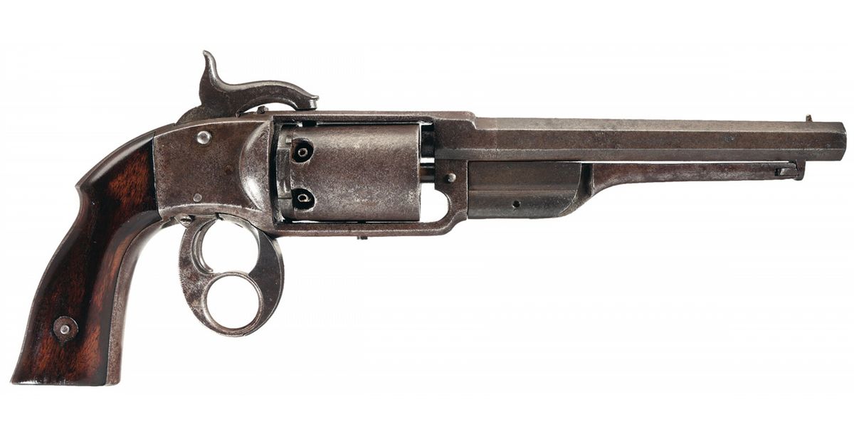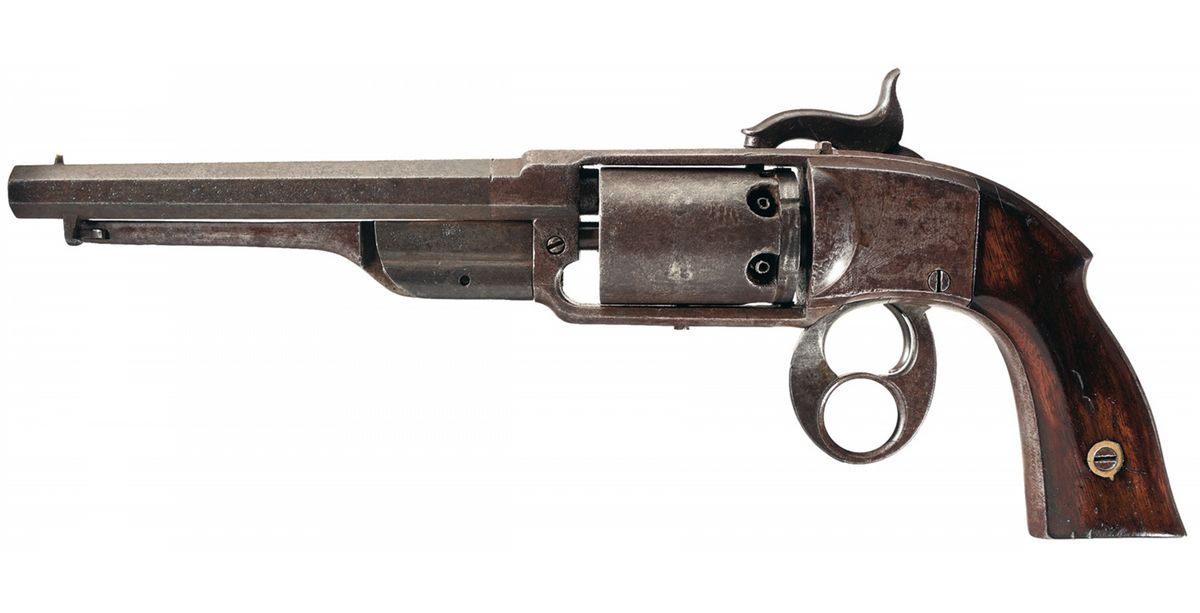 This is a very rare example of one of the estimated 50 Fourth Model Figure 8 Revolvers that were manufactured by Savage & North from 1856 to 1859. The revolver is very similar to the Third Model but with an iron frame with flat sides. The number "4" is present on the loading lever. The top strap is stamped "E. SAVAGE, MIDDLETOWN CT./H.S. NORTH PATENTED JUNE 17TH 1856". The left side of the loading lever is stamped with a 1858 patent date (faint). Fitted with smooth varnished walnut grips.