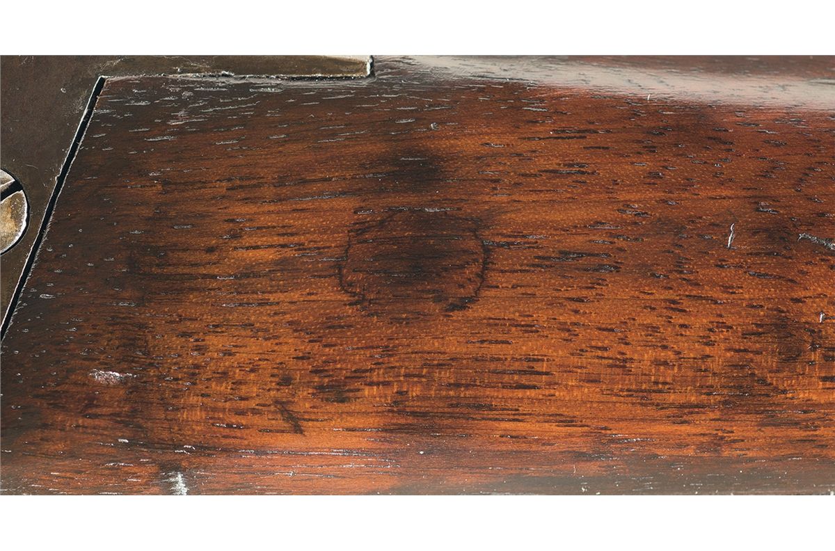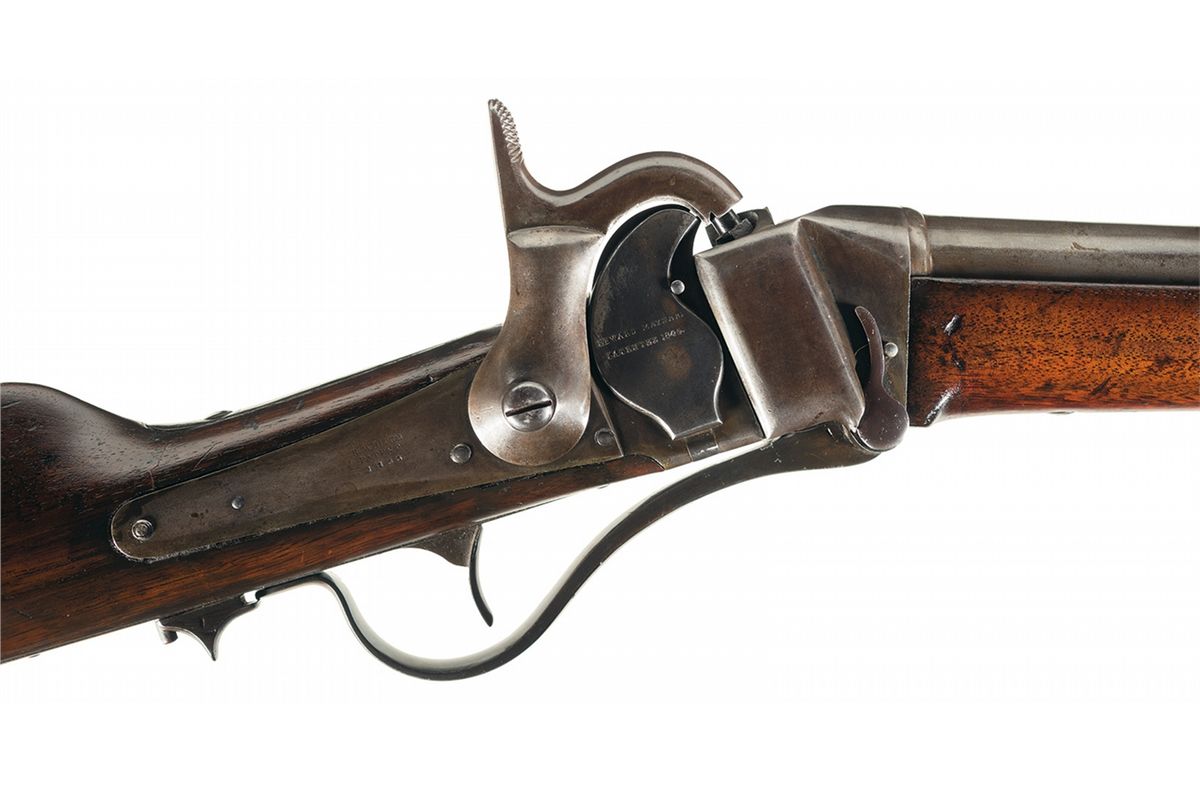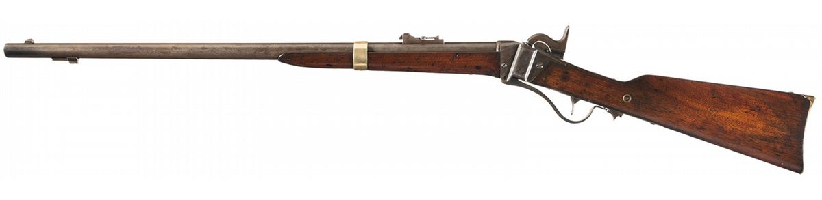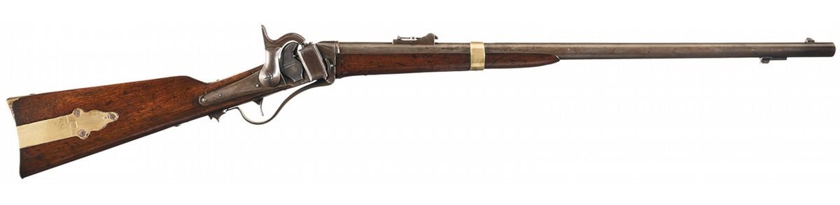 This is an extremely rare example of the approximately 263 Model 1855 Navy rifles manufactured by the Sharps Rifle Co., circa 1856. At least 200 of these rifles were received by the U.S. Navy in 1857 and issued to the frigates USS Wabash, USS Merrimack, USS Plymouth, USS Mississippi, and USS Minnesota. The rifle has a distinctive 27 inch round barrel with stud for a saber bayonet near the muzzle and a carbine forearm. The barrel has a block-mounted iron front sight and a long range, folding leaf, rear sight graduated to 400 yards. The slant breech receiver has a Maynard tape-priming device marked "EDWARD MAYNARD/PATENTEE 1856" on the magazine door. The side of the lock plate is marked "R. WHITE'S/PATENT/1855". Approximately 50 of the Navy Model 1855 rifles were initially manufactured with a Rollin White self-cocking device. All but 12 of the Rollin White rifles were rejected by the Navy and the remaining 38 were returned to Sharps to have the Rollin White devices removed. The 38 altered Model 1855 Navy rifles retained the "R. WHITE" patent markings on the lock plate. The remaining 201 Model 1855 Navy rifles had Sharps markings on the lock plate. This is one of the very few Model 1855 Navy rifles with "R WHITE" marked lock plate extant. The upper receiver tang is marked "SHARP'S/PATENT/1848" in three lines followed by the serial number "20430". The barrel band, patch box and buttplate are brass. The stock and forearm are straight grain American walnut. An illegible Navy final inspection mark is stamped on the left side of the stock wrist.