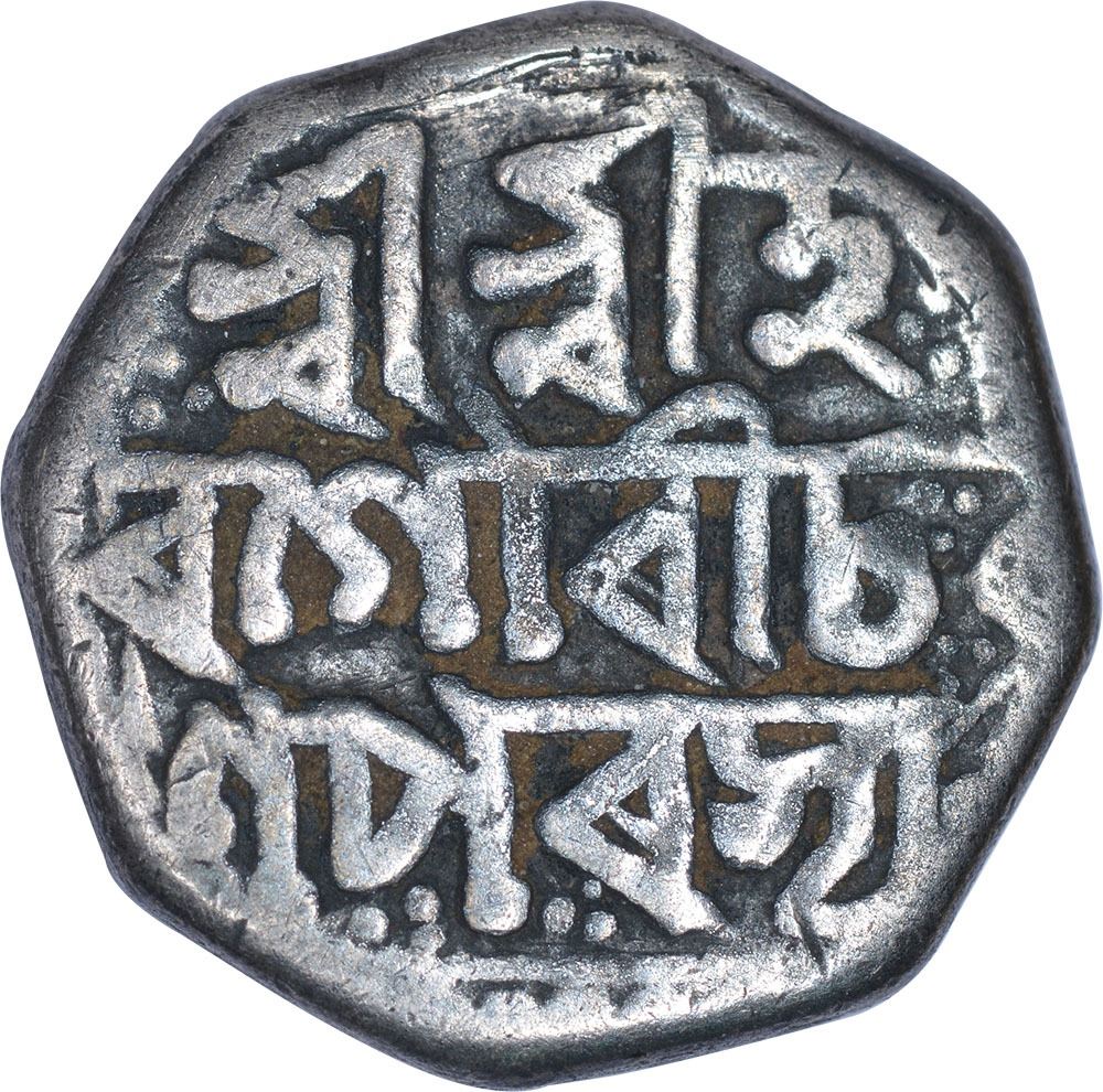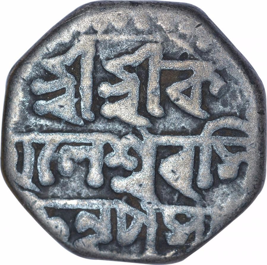Assam Kingdom, Kamaleswara Simha(SE 1717-1733/1795-1811AD), Silver1/2Rupee,Obv: sri sri ha / ra / gauri chara / na / parasya,Rev:sri sri ka / malesvara si / mha nrapasya, 5.35g, 16.95mm,(KM # 237),about very fine, ExtremelyRare.