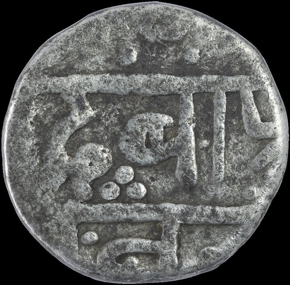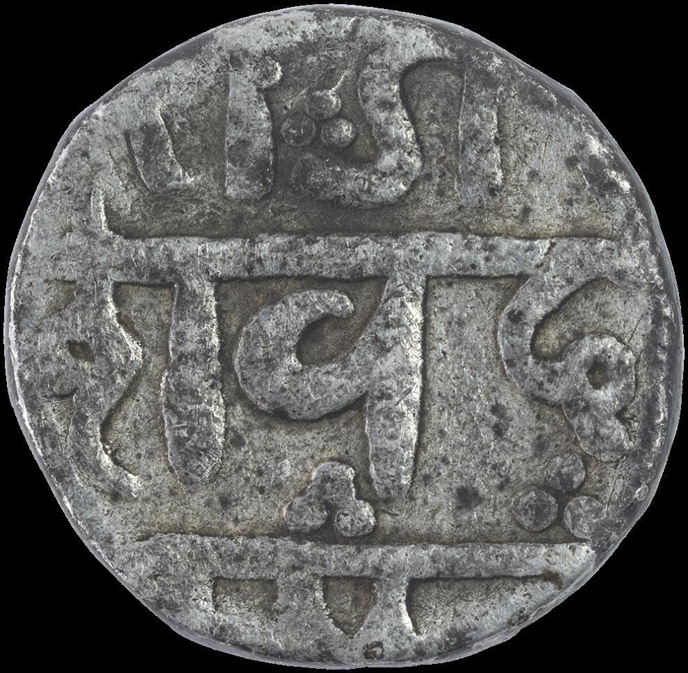 This is an undated rupee with nagari legends, though many of the letters fall off the flan but a reasonable construction may be made from what can be seen. The reverse reads as Raja/ Shivachha/ trapati and it is possible that Shri precedes this, and the obverse is certainly as Shri Ja/gadamba(be) prasanna.