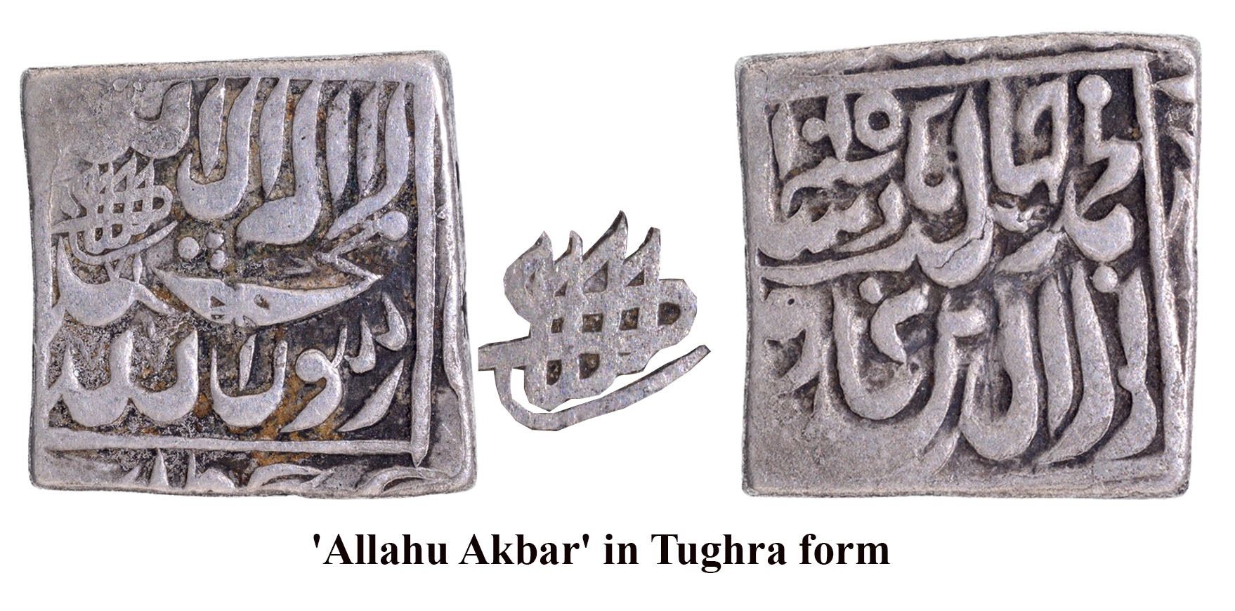 Jahangir (AH 1014-1037/1605-1627 AD), Bang Type with Allahu Akbar, Silver Square Rupee, AH 1015, Obv: Arabic legend The Kalima Shahada & 'Allahu Akbar' in Tughra form on the left side within a square, within a square, four Caliphs' names around, Rev: Persian legend "Noor ud din Muhammad Jahangir Badshah Ghazi" and sana 1015 Hijri, 10.6g, 18.62 x 18.54mm, (Unlisted in KM), no test mark, about extremely fine, Extremely Rare.