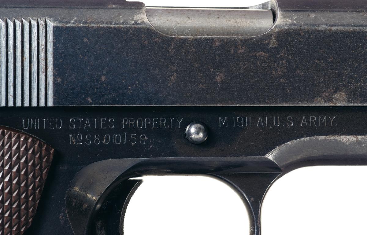 Condition: Very good, showing 85% of the original high polish deep blue finish, with a brown patina showing on the grip straps, scattered spotting and mild handling marks overall. The serial number appears to be a factory double strike, which is known to have occurred on some Singer pistols seen on the market. Grips are very good, with a few small pressure dents. Mechanically excellent. Due to the extreme brevity of Singer's tenure as an arms maker, the pistols Singer produced were produced virtually by hand and individually fitted with an eye for detail and appearance. The end result was not only some of the most attractive U.S. government issue pistols ever made, but also some of the most scarce, representing the pinnacle of U.S. 1911/ 1911A1 collecting.
