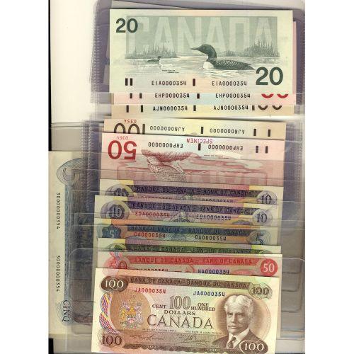 Extremely Rare Trio of Specimen and low serial number sets all with same numbers. This lot includes a Specimen Bird set #0354, A multi colour and Bird series Low Serial number sets with the numbers #0354 as well. 21 notes in all . A must see.