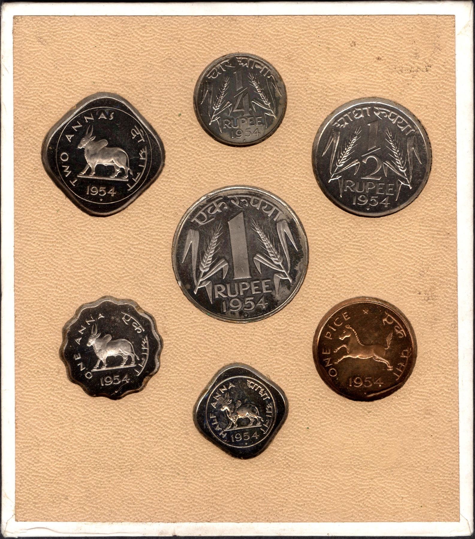 Republic India, 1954, UNC Set, Decimal Coins Set (Regular Series), Set of 7 Coins, 1 Rupee, ½ Rupee, ¼ Rupee, 2 Annas, 1 Anna, ½ Anna & 1 Pice, Bombay Mint, (RB # 4), superb quality, intact condition in original cream cardboard, UNC, Extremely Rare.