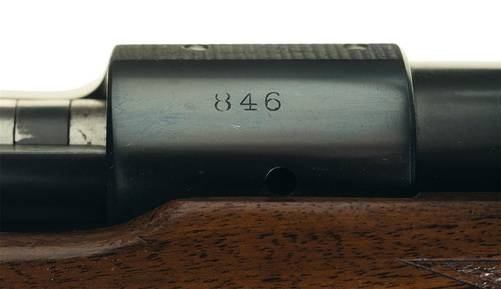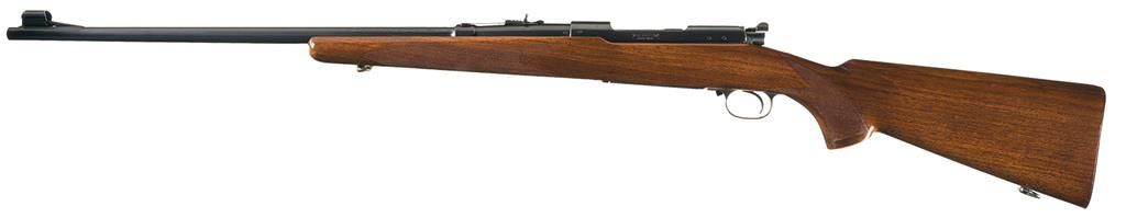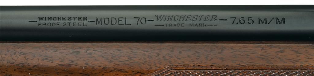 Manufactured in 1936. The rifle is chambered in 7.65 mm Argentine, also known as 7.65 mm Mauser, with a total production from 1936-1943 of only 31 according to Madis' "Winchester Handbook". Mr. Madis' goes on to state that these unusual calibers "were made for the ballistics test lab, while a few have also been examined which were made on special order." Hooded ramp front sight and elevation adjustable rear sight on a barrel marked with the Winchester legend on the left side and two line address on the right side. A Winchester factory proof is stamped on the barrel and receiver (double stamped). The early production receiver is tapped for scope mounting at the front and sight mounting on the left rear side. Cloverleaf receiver tang, pre-war safety, polished bolt numbered to the gun and sling swivels. The checkered pistol grip stock has a checkered steel buttplate.