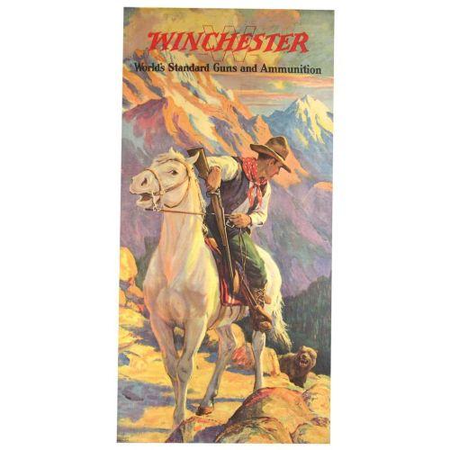 Extremely Rare Winchester paper sign. Worlds Standard Guns and Ammunition. Depicting cowboy on horseback fleeing a black bear. No Bands, glued to hardboard. 17 1/2 X 35 1/2 inches.