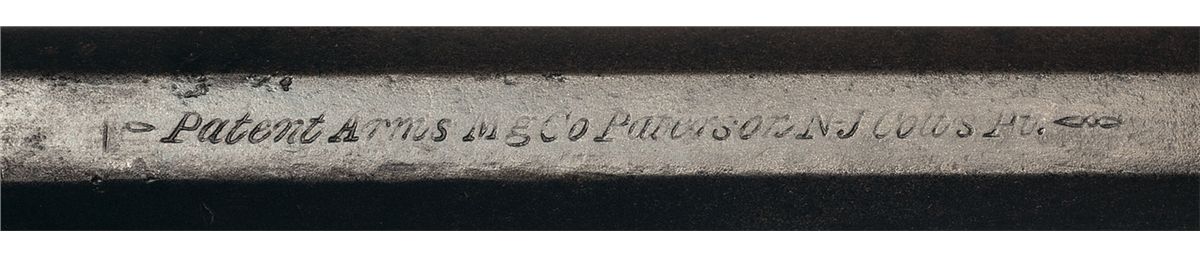 This is an extremely rare example of a desirable Paterson No. 3 Belt Model Revolver. Samuel Colt manufactured approximately 450 No. 3 Belt Revolvers between 1837 and 1840. The No. 3 Belt Revolvers were serial numbered with the No. 2 Revolvers and account for about one-half of the production of the two types. The top barrel flat is marked: "-Patent Arms M'g Co Paterson N-J Colt's Pt.-" reading from breech to muzzle with arrows at either end of the legend. The cylinder has traces of the original roll-engraved Centaur scene. The matching serial number, "593", is marked on the interior of backstrap, back of cylinder, back of barrel, inside front of hammer, cylinder rotation collar, and on the inside of the trigger. All blue finish, brass blade front and hammer notch rear sights and fitted with smooth walnut grips with the distinctive flared butt.