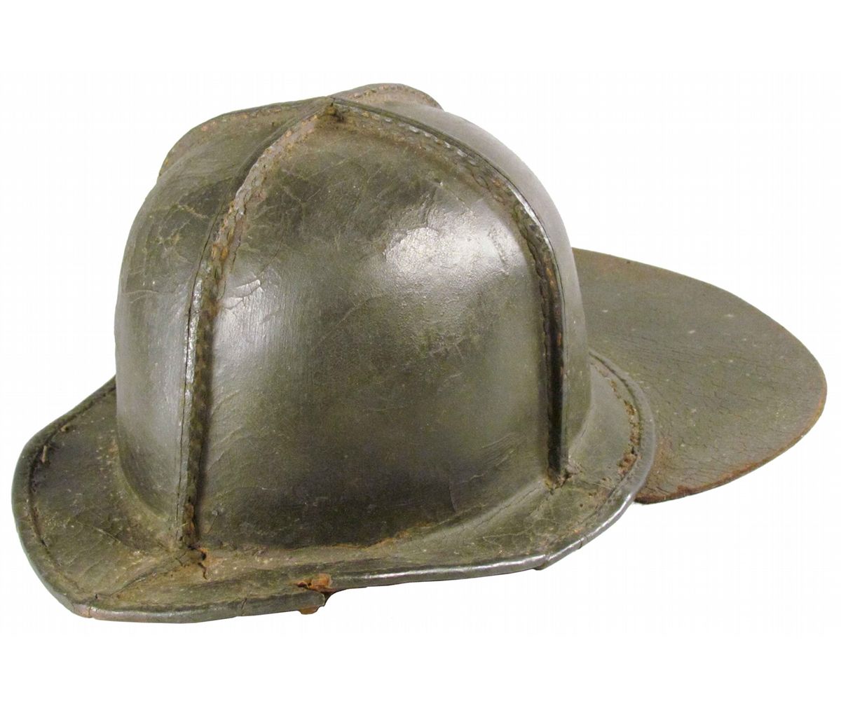 Extremely Rare and Early Leather Fire Helmet, Ca. 1840. Early or Poor Boy Style. Helmet pre-dates wire in brim. Reinforced leather brim and attached rear brim as water shield. This helmet is extremely rare and pre-dates the more modern helmet manufactured in one piece. Tear in front brim and in leather/cloth liner otherwise overall good condition.