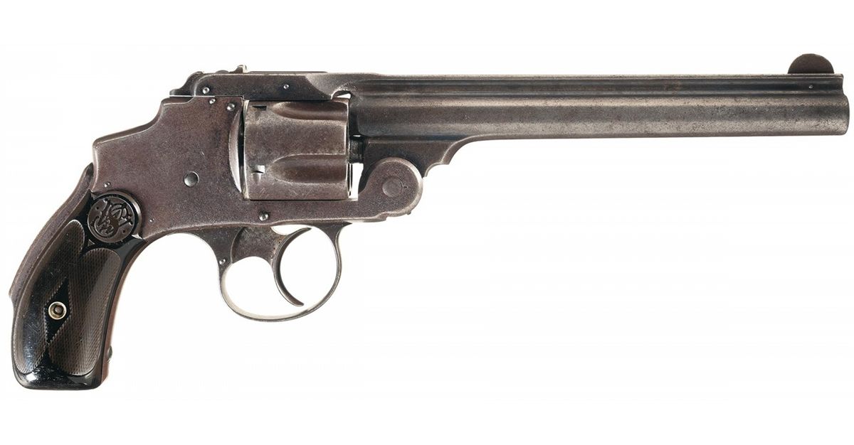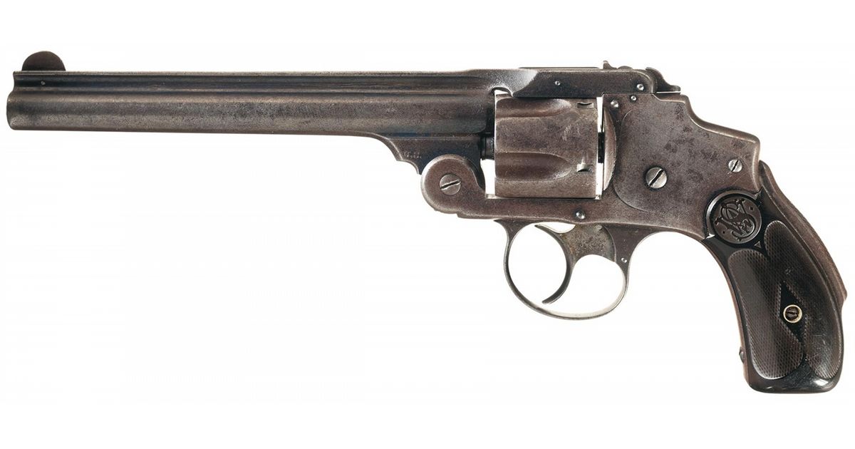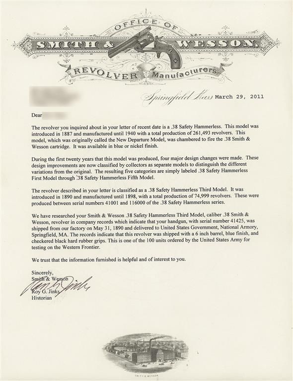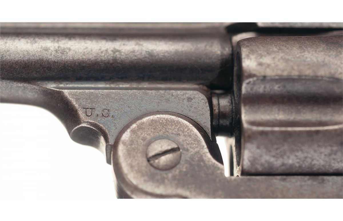There were only 100 of these 38 Safety Hammerless Revolvers sold to the U.S. Government in May of 1890, making these one of the most difficult and desirable of all U.S. contract arms. The revolvers are Third Models, although they are in the Second Model serial number range, 41333 - 41470 (note serial number of this revolver). The revolver has the push button barrel release, two line address/patent dates on the top of the barrel rib and is marked ''U.S." on the left side of the barrel lug. Casehardened trigger, five round fluted cylinder and checkered hard rubber grips with S&W logos at the top. The serial number on the butt, cylinder and barrel all match. The included factory letter confirms the barrel length, finish and hard rubber grips with the revolver shipped to the U.S. government, National Armory, Springfield, MA on May 31, 1890. With the revolver is a period leather flap holster