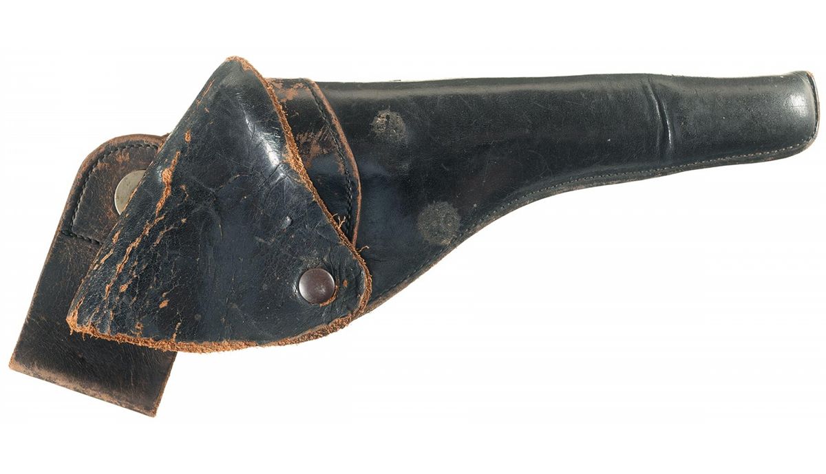 Very good. The revolver retains traces of the bright original blue finish (in the protected areas) with a mottled gray patina on the balance. The heavily worn grips are good with some minor handling marks. Mechanically fine. The holster is good showing age cracking (mostly on the flap) with overall tight stitching. The rare U.S. military Smith & Wesson revolver is seldom found and is absent from most U.S. martial collections!