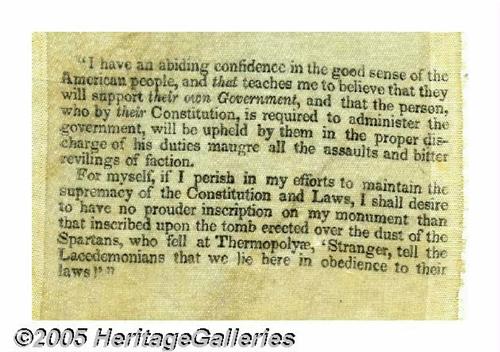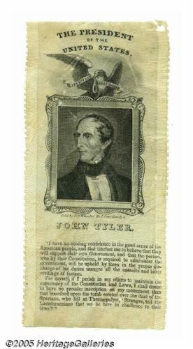 <B>Extremely Rare and Important John Tyler Silk Ribbon</B></I> No president is tougher for collectors than Tyler as he assumed the presidency in 1841 upon Harrison's death, and had little support for the 1844 nomination. Sullivan lists a meager four items, all prohibitively rare; Hake's 1789-1916 volume lists nothing for Tyler. Sullivan and Fischer's ribbon book lists two Tyler ribbons, but pictures only one. The pictured example has the same image as the present copy, but lacks the <I>marvelous</B></I> quote below. It is certainly safe to say that fewer than ten total examples exist in the hobby of all Tyler ribbons, and this design is surely the most desirable! Excellent condition but for trivial bit of damage in upper right corner, as seen in the photograph. One of the major items from the former Joe Brown Collection. Lot:256