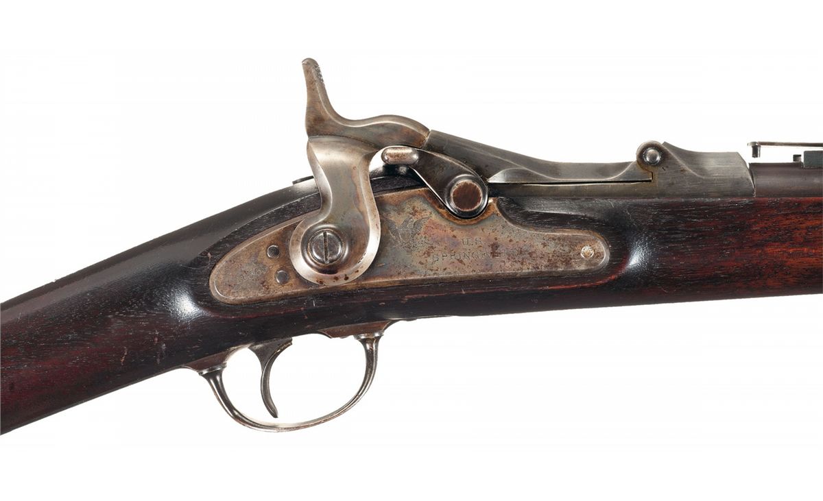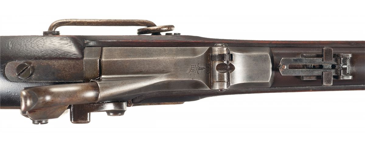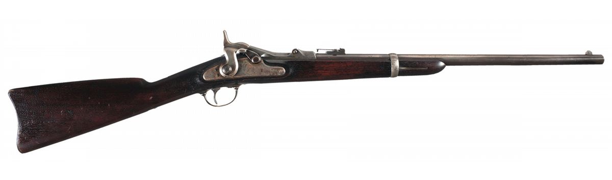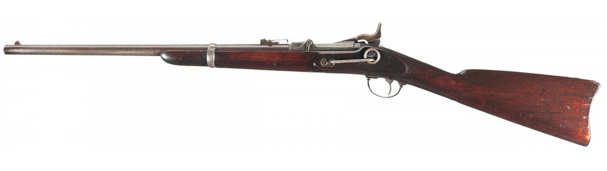 During the post Civil War period the U.S. Government experimented heavily with developing metallic cartridge rifles. One of the most cost effective methods for the Government was by taking left over muzzle loaders and converting them into single shot metallic breech loaders. The primary conversion method was using the Allin conversion on 1863 rifles during the 1868 to 1870 time period. Several variations were developed, all with very low production numbers, using the 50-70 centerfire cartridge. This series of rifles and carbines eventually evolved into the successful Model 1873 Rifle and Carbines Series. In 1870 the last variations of rifle and carbines were produced, this carbine being one of them. Only 341 of these carbines were manufactured, and the fact that the U.S. Government was entering the Indian War period makes it amazing that any survived at all. The characteristics of this model are that there is no serial number and the high arch breechblock is marked "1870/eagle head/crossed arrows/US". The Civil War type lock plate is dated "1863" at the rear and the eagle/shield motif with "U.S./SPRINGFIElD" is ahead of the hammer. It has a folding ladder rear sight graduated to 900 yards, the correct two-click tumbler and two piece trigger guard. The stock has a saddle ring bar with ring mounted on the left flat, a weak cartouche on the left flat and a "US" marked buttplate.