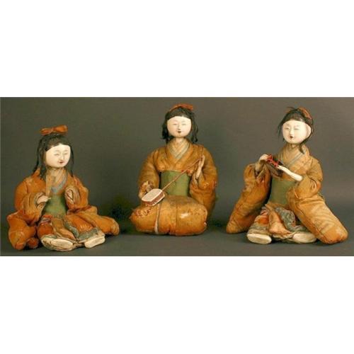 Very Old Edo Period (circa 1720) Extremely Rare Set of Three Female Musicians for Hina Matsuri (Girls Day Festival) Almost all musician dolls were male, making this group highly unusual, especially from the 18th century. They have the most wonderful features painted on carved wood covered with burnished gofun (oyster shell lacquer). The textiles are chirimen silk. 8.75 inches (22.5 cm) tall. From a widely renowned and published collection that has been exhibited at the Metropolitan Museum and Japan Society.