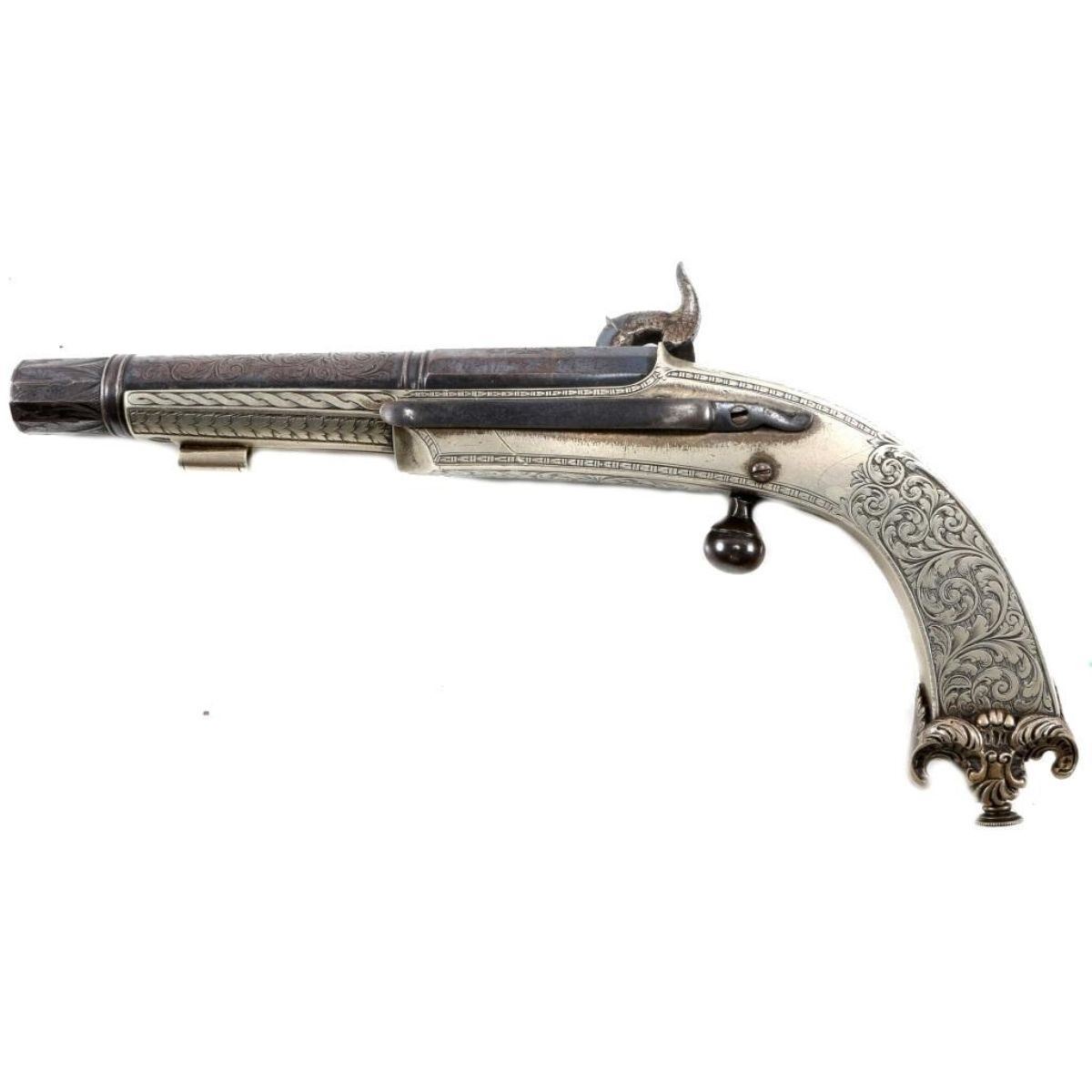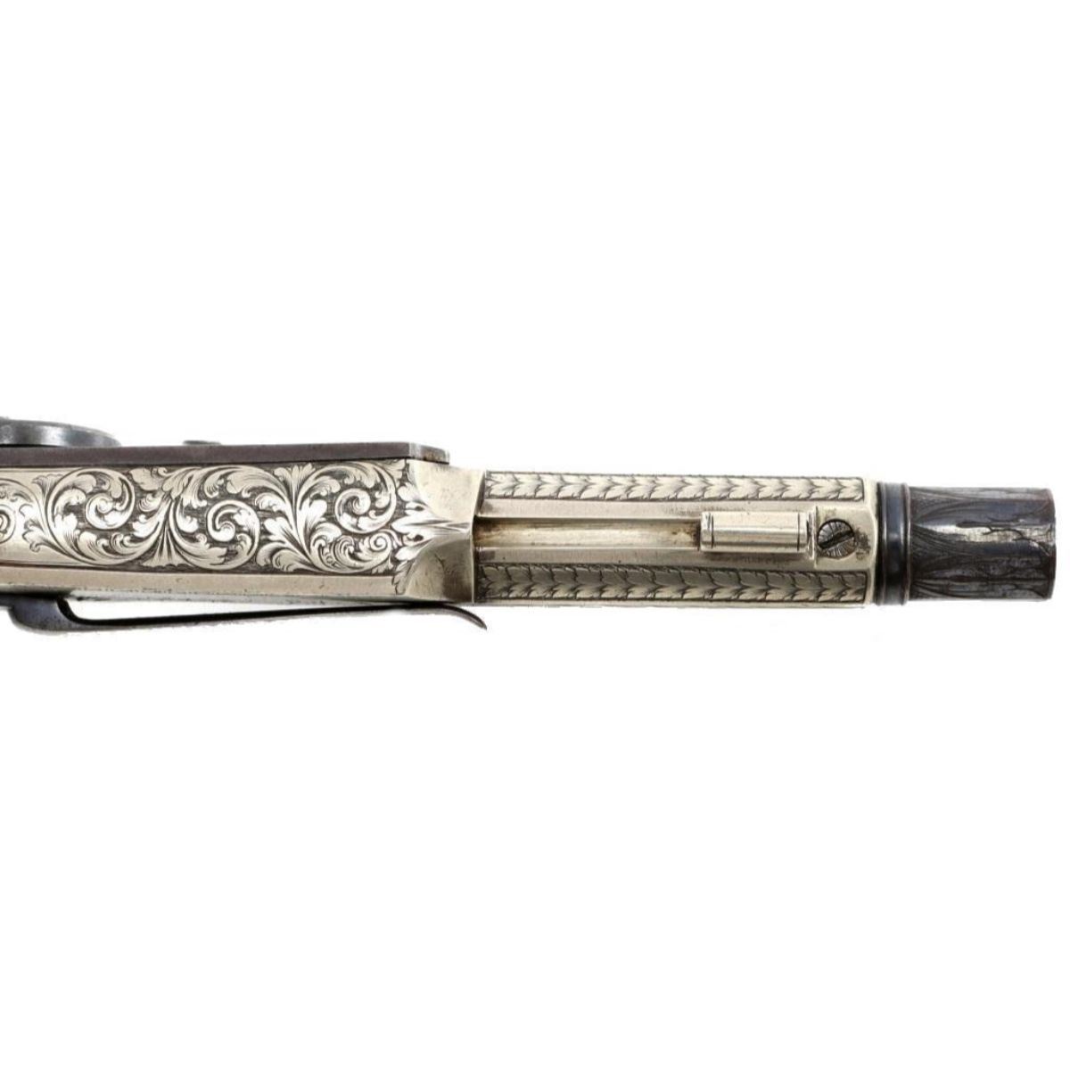 Floral engraving throughout grip and barrel. Fish motif on hammer. Lion rampant on back of grip. 9.25" overall. Caliber / Gauge: 11mm Barrel Length: 5.75" Condition: Very good. Light wear. Some original blue remaining.