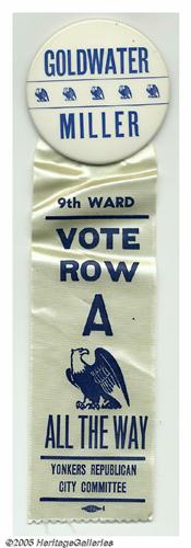 <B>Extremely Unusual 3 1/2" Goldwater - Miller Button Variety</B></I> With large Yonkers, New York ribbon as shown. We cannot recall ever seeing this design and blue and white coloration before. Great shape. Overall length 11.75" with ribbon. Lot:264