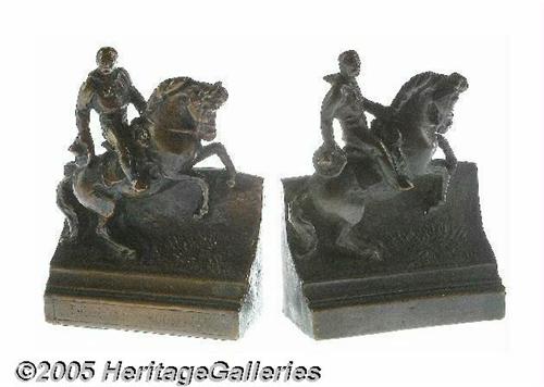 <B>Extremely Unusual Bronze Book Ends of Theodore Roosevelt as a Mounted Cowboy</B></I> Each signed, "Paul Herzel" (American, 1876-1950). Almost certainly dating from the early 1900s. Very pleasing, clearly-recognizable TR image. While these purport to be a "pair," they are most probably individual pieces from two separate sets of book ends, united later. The patinas are slightly different, and one has Roosevelt's name across the front of the the base, while the other has it across the back. But they work just fine as a pair now. Subject and quality of execution make this among the nicest of the many TR book ends we have seen. Note that they are actual bronzes, not simply bronze-finished base metal as are many such items. 6" tall, 4.375" wide, 2" thick. Lot:261