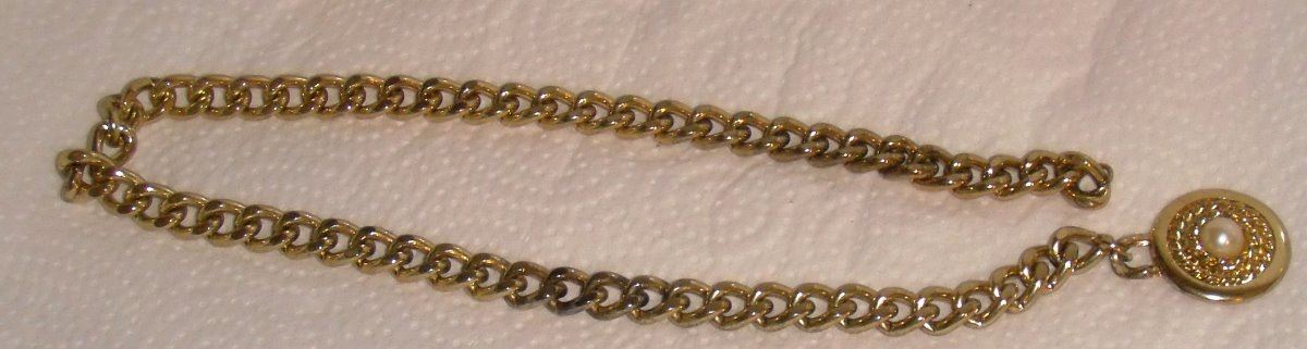 Extremely heavy chain about 12 inches long with medallion like a pearl (not one?) as is no clasp... necklace; old and yet not used yet in mother 91 years of age in her collection; collect or seek to give now this trendy like a 'new wave' or 'punk' costume jewelry as dolphins are popular.