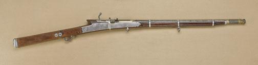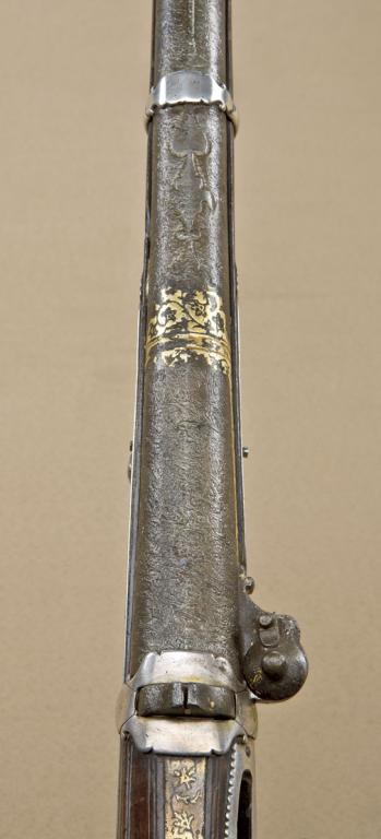Extremely high-quality Indian match-lock carbine, circa 18th to 19th century, with watered and gold damascene barrel, silver lockplates, and silver mounts. The carbine measures 41-1/2” overall, with 24-1/4” barrel showing cannon type muzzle, and water-steel pattern with gold damascene decorations. The gun is in good condition and is .50 caliber smoothbore. The gun is nicely stocked in a select hardwood similar to rosewood withselect grain. The stock is good to very good with a couple of small losses, normal aging. The lockplate and sideplate are solid silver. As is the silver cap on the butt, bands, and other mounts. The carbine shows a band for a sling and would be a perfect size for carrying on horseback as a cavalry type carbine. Est: $1,500 - $3,000