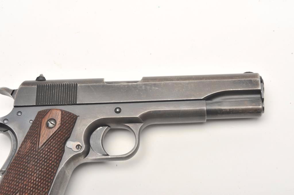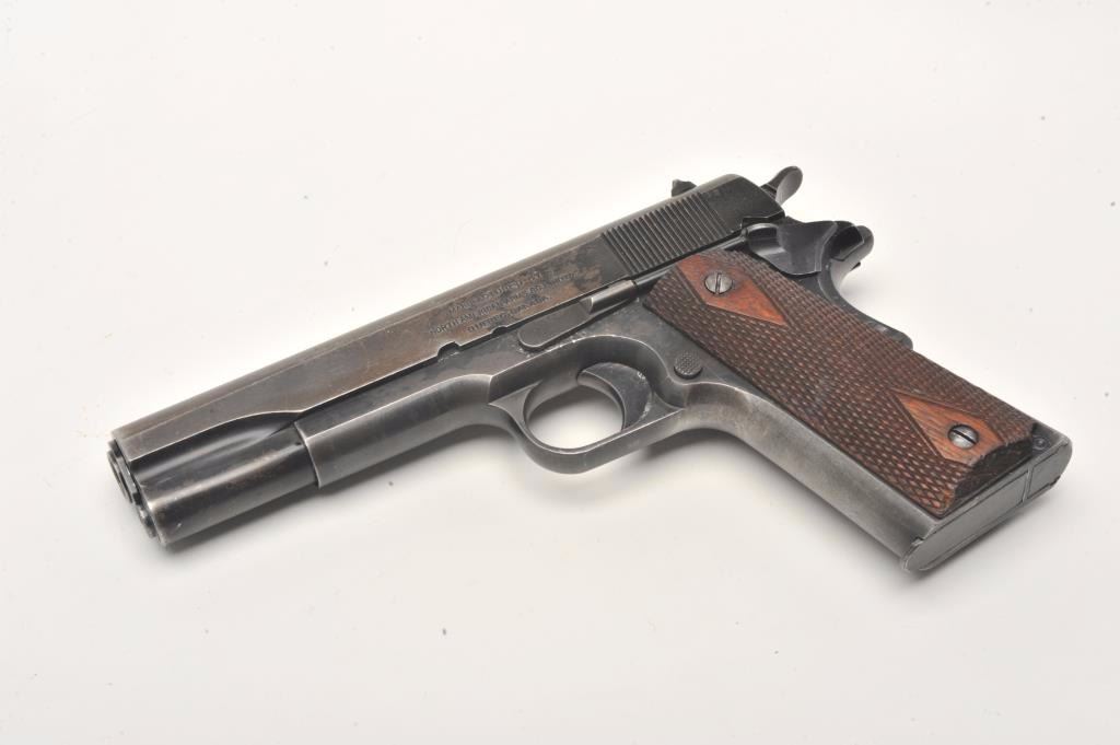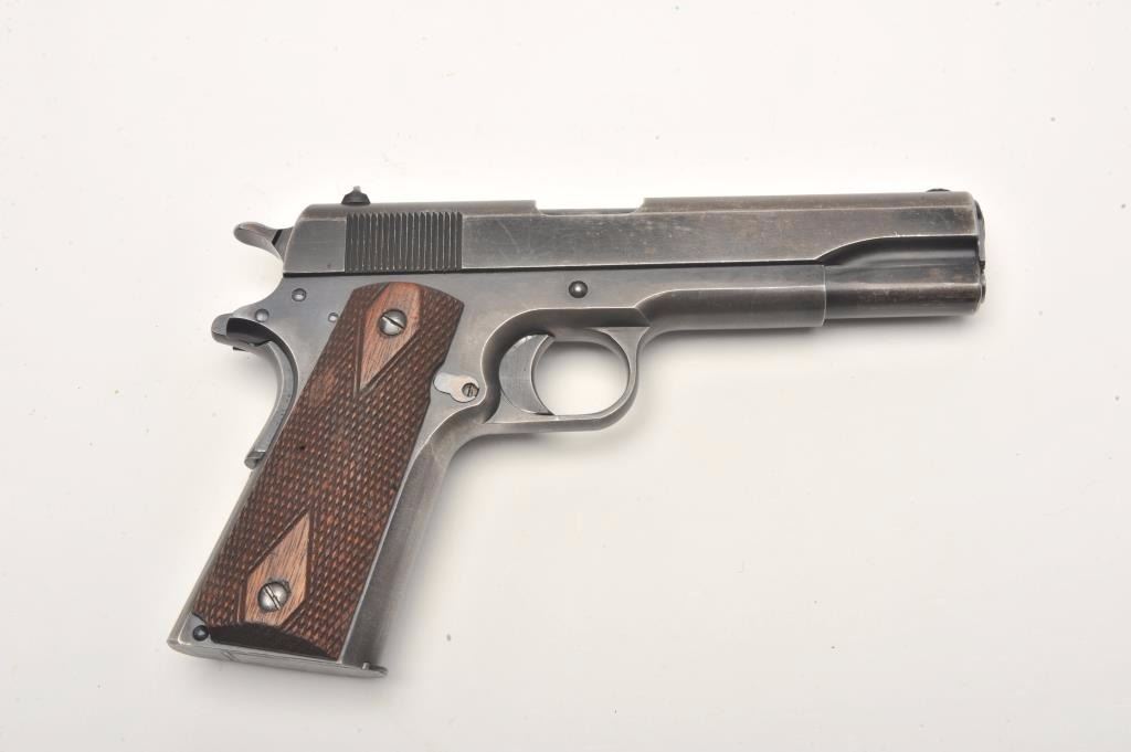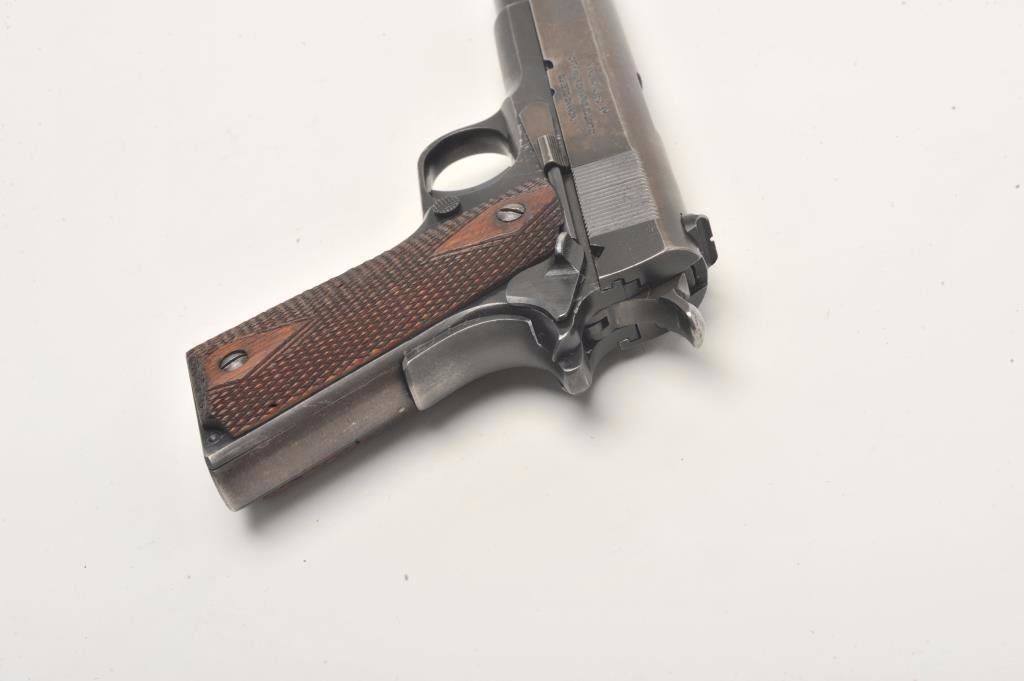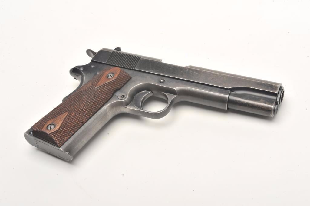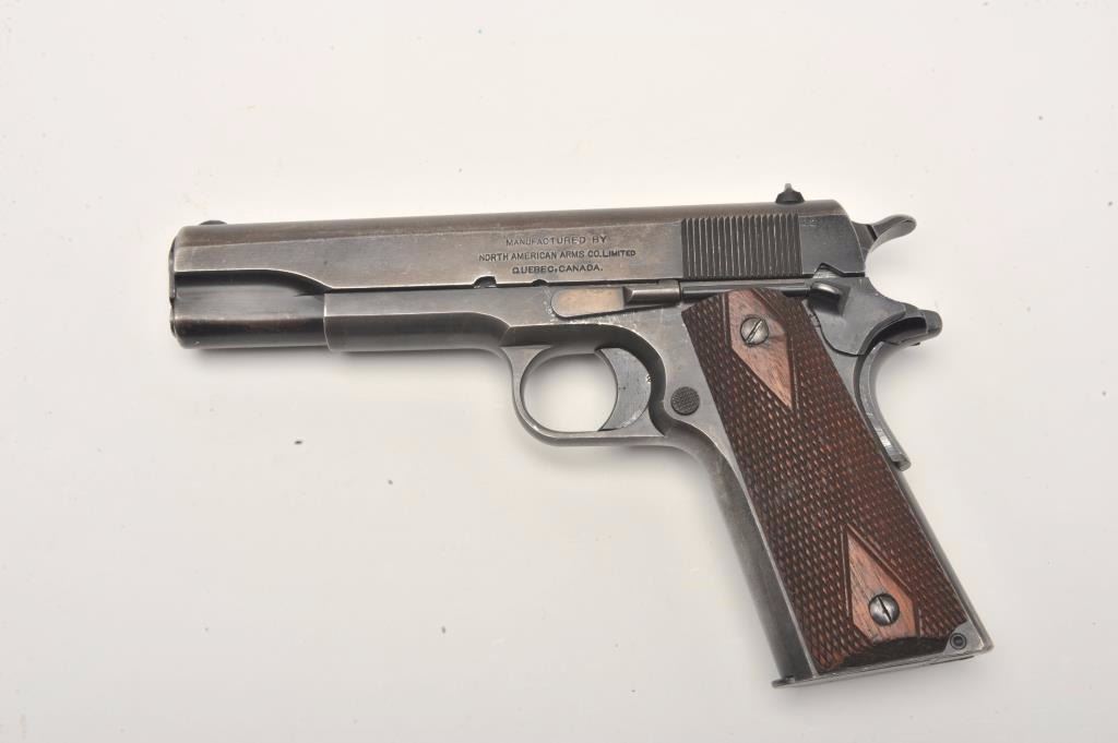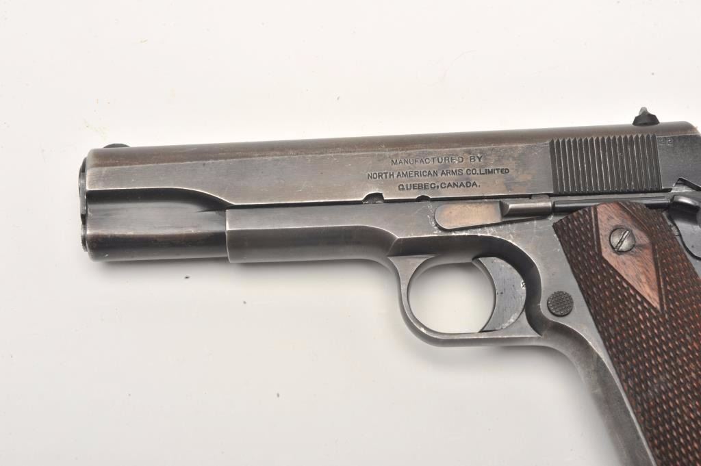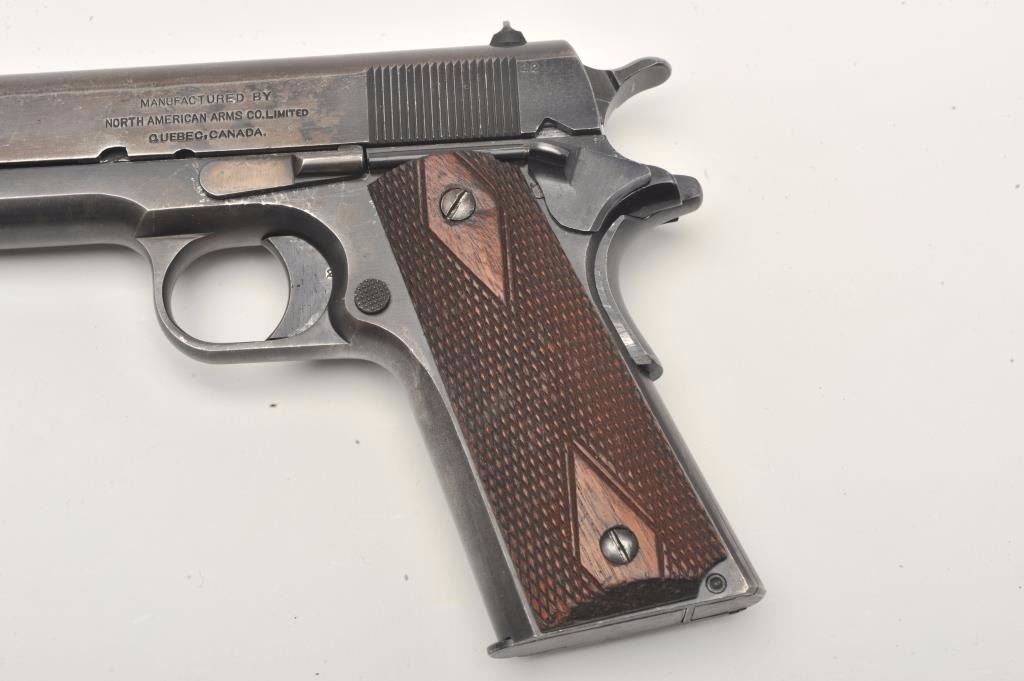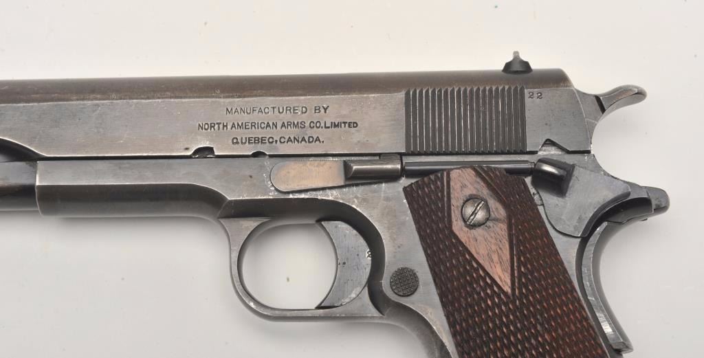 Extremely rare and desirable North American Arms Co. Model 1911 semi-automatic pistol, .45 caliber, 5” barrel, blued finish, checkered wood grips, two-tone magazine, S/N 22, in overall fine condition displayingconsiderable blue finish with some areas of flaking and with balance gone to a pleasing brown patina; fine bore, crisp action, sharp markings and visible S/N “22” marked on back left side of slide and on left rear side oftrigger. Per Standard Catalog of Military Firearms, North American Arms Co. (of Canada) made 1911’s for the U.S. but none were delivered to the Army. Less than 100 pistols are believed to have been assembled fromparts; rarely seen and few sold publically. A key piece for the serious military pistol collector! (C&R/PPT). Est.: $20,000-$40,000.