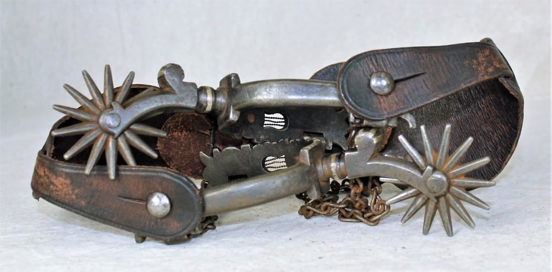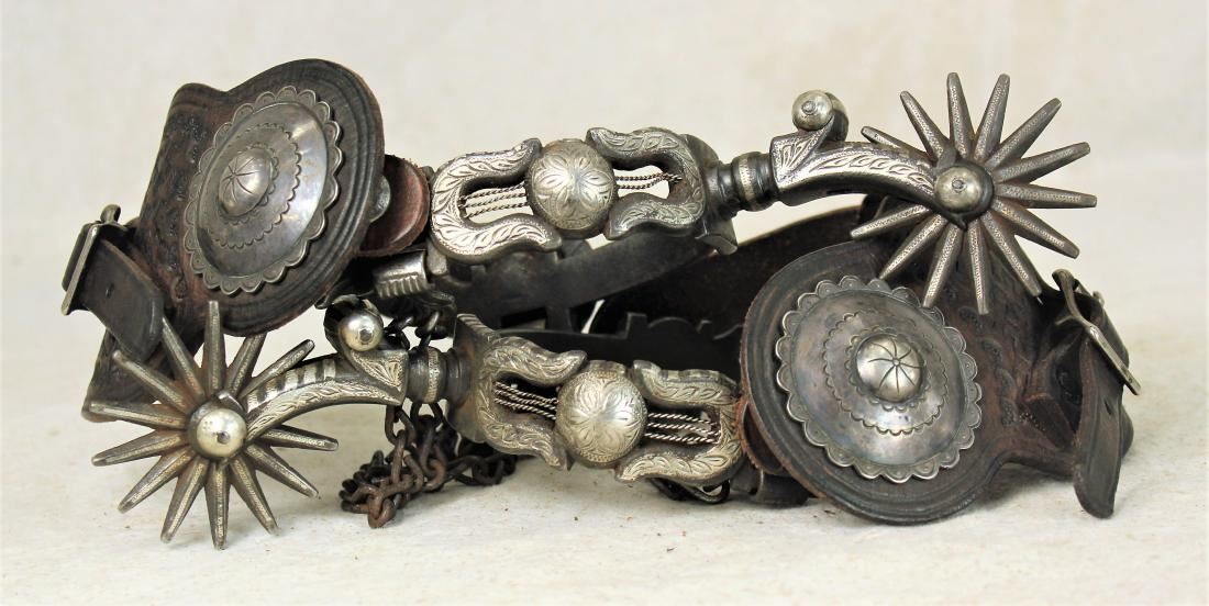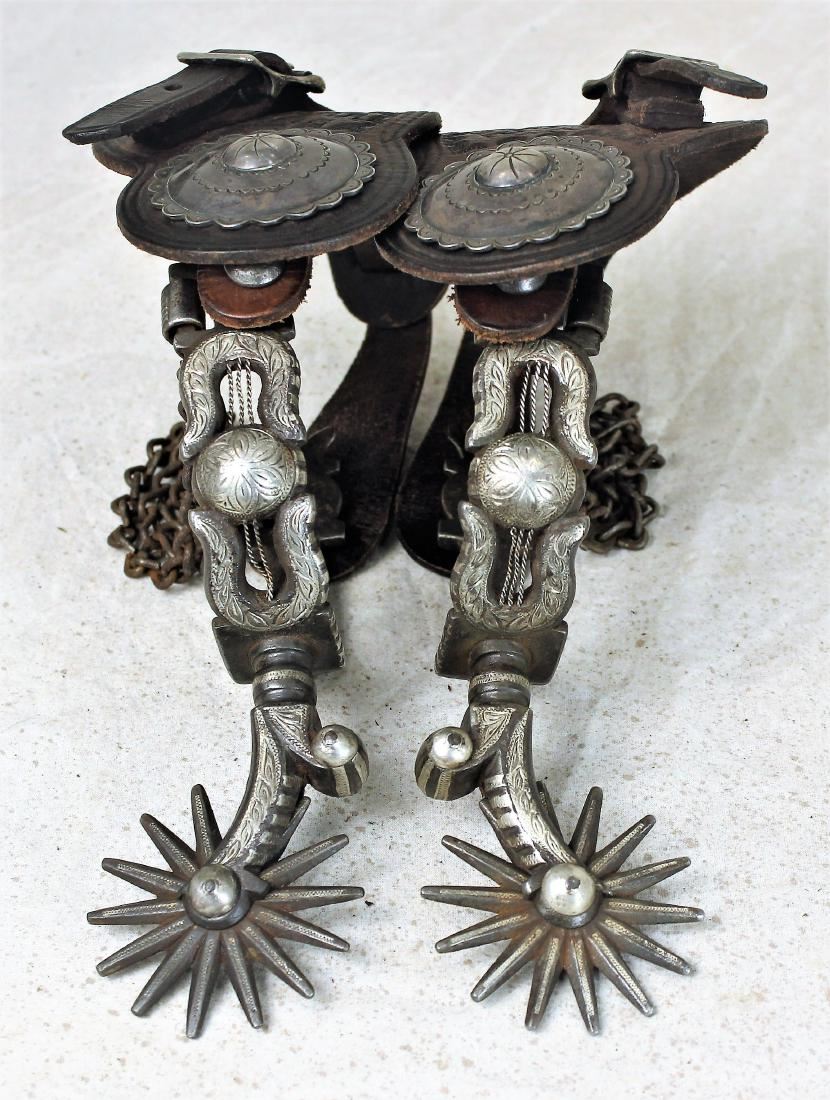 Incrediable early single mounted California style spurs with laying down cut-out harps, engraved domes and large inlaid rowels, complimented by silver concho straps.