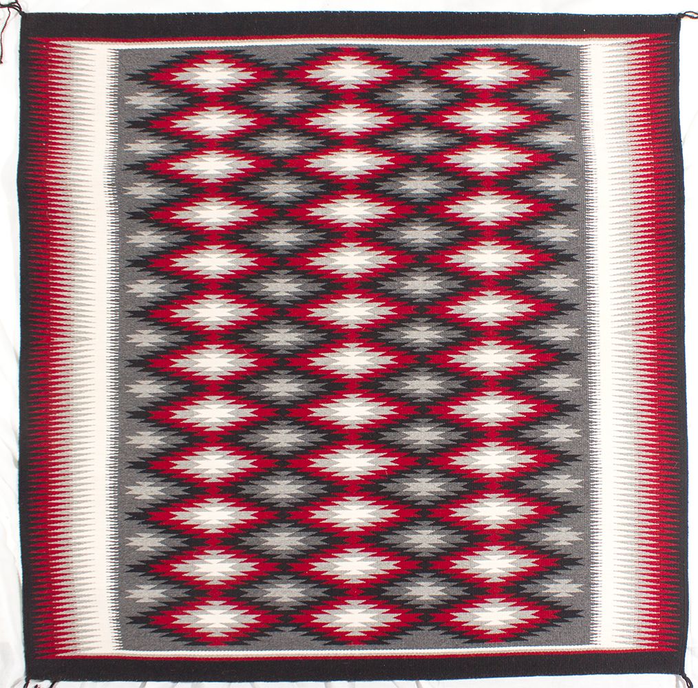 An almost square weaving from the Crystal region, 42 x 43,” in black, red, gray and natural colors. The weaver is Rose Claw. It was purchased from the Cameron Trading Post in 2000 and is in perfect condition. Fairbanks Collection - HKA#65401