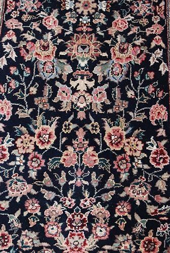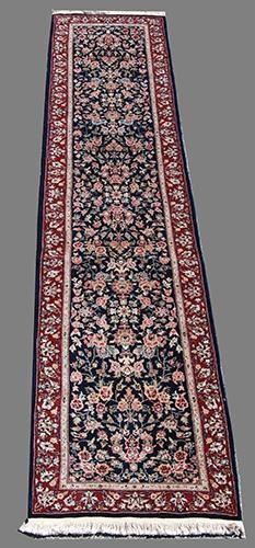 Beautifully done Kashan design runner w/silk highlights.Size 2.3 X 10 feet, made of fine quality lamb's wool/part pure silk pile on cotton foundation, all natural vegetable dye, incorporating a beautiful free flowing allover floral pattern; finished off beautifully with an intricately done floral border. Hand woven by Himalayan master weavers using Kashan design and pattern.
