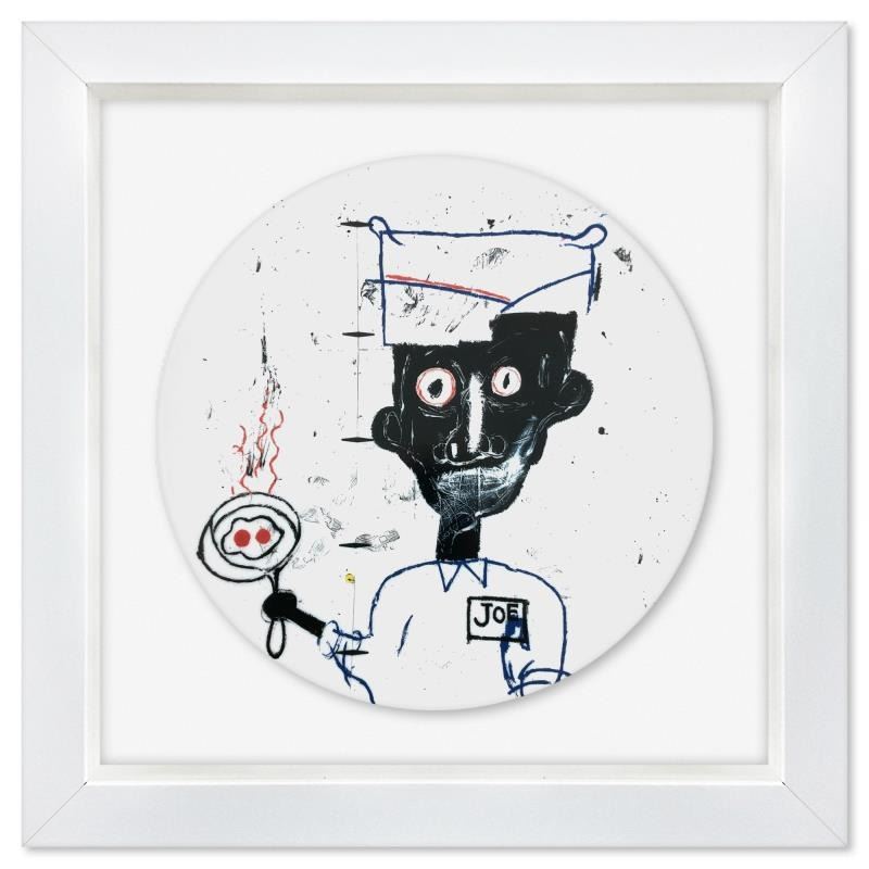 "Eyes and Eggs 1983" is a Limoges porcelain plate bearing the plate signature inverso of Jean-Michel Basquiat (1960-1988). This plate is custom framed and floated on linen. Measures approx. 16" x 16" (frame), 11" (plate diameter).