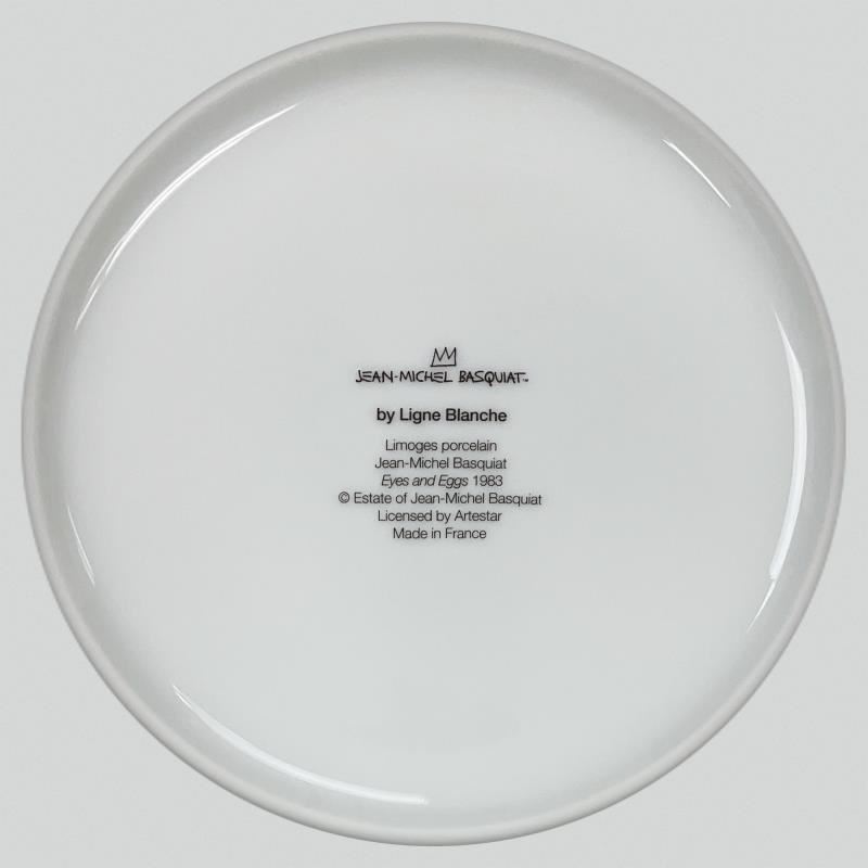 "Eyes and Eggs 1983" is a Limoges porcelain plate bearing the plate signature inverso of Jean-Michel Basquiat (1960-1988). This plate is custom framed and floated on linen. Measures approx. 16" x 16" (frame) 11" (plate diameter).