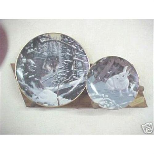 The large plate is 9-3/8" and the smaller plate is 6-1/2". They come with a wood Wall Display rack.Created from the original painting by renowned willife artist Derk Hansen. Mint in boxes with certificates. The Wall rack is oak and has a plaque that says "Timber Wolf and Hare Derk Hansen. It has pegs which the plates sit on