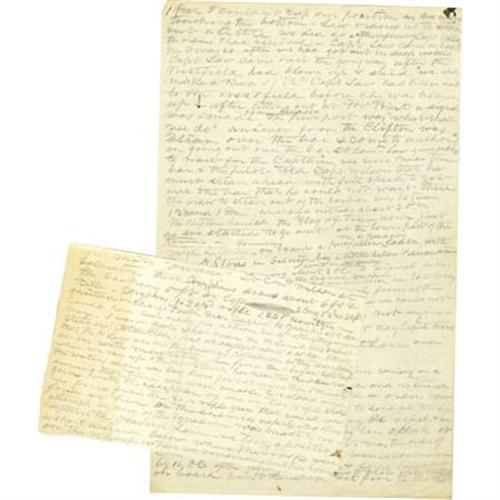 <B>Thomas D. Babb: </B></I><B><I>Eyewitness Account of the Battle of Galveston Bay.</B></I></B></I> An original manuscript draft of testimony given in the case of Lieut. Commander Law, being an eyewitness account of the Battle of Galveston Bay. [Np. 1863]. Two pages densely written, in pencil, on folio sheet, plus an additional page on smaller half sheet. Overall condition is quite good. Babb was Acting Master on board the Union ship, <I>Owasco</B></I>, during the Battle of Galveston Bay in 1862-63. His testimony presents a fine eye-witness account of the attack, counterattack, surrender of the <I>Harriet Lane </B></I>(a Union ship), the burning of the <I>Westfield </B></I>(also a Union ship), and other details of this engagement. The battle occurred as part of the Union blockade of the Texas coast, with the counterattack of Jan. 1, 1863 by the Confederates leaving the port of Galveston under Confederate control for the rest of the war. An extract from the manuscript follows: "<I>Actg. Master Tho. D. Babb - testifies in the case of Lt. Com. Law as follows - Jan. 1st 1863 attached to Owasco gunboat in Galveston Harbor on blockade duty & to defend the place...there were at Galveston the following U.S. vessels steamer Westfield, Clifton, H. Lane, Owasco, Sachem, & schooner </B></I>[Corypheus<I>?], six in all. Commander Renshaw was in command. The crew of the Owasco were at quarters about 20 past 4 A.M. On the occasion of the attack of Rebel troops on Galveston & the Harriet Lane - one officer on deck during the Mid watch - two steamers at first and another afterwards attacked the H. Lane - three in all...The Clifton was firing at the enemy's steamers on the flats above and at the town she couldn't fire at the steamers that attacked the Harriet Lane without firing over us...Lt. Com. Law ordered us to hoist a flag of war & keep our position. I answered him that I couldn't keep our position as we were touching the bottom. Law ordered us to steam out a little...I knew the Harriet Lane was in the enemy's possession as they were firing on us with musketry, we fired the 11 in gun solid shot...no other attempt by any of the squadron was made to recapture the Harriet Lane.</B></I>" <BR><BR><B>Reference:</B></I> Eberstadt 162:319.<BR><BR><b>Shipping:</b> Flat Material, Small (<a target="_blank" href="http://www.heritageauctions.com/common/shipping.php">view shipping information</a>)