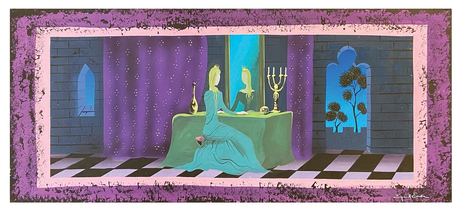 (Disneyland, 1957) An original concept painting by Eyvind Earle for the Sleeping Beauty Castle Walkthrough attraction. When Walt Disney asked his Imagineers to find a creative use for empty space within Sleeping Beauty Castle, they settled on a walkthrough featuring dioramas that would tell the story of Sleeping Beauty, which was currently still in production at the studio. Walt reached out to Eyvind Earle, background artist and color stylist for the feature film, and Earle created a series of color concept paintings of potential scenes. These scenes were created as though the viewer was looking through a window. This stunning original painting is one of Earle's concepts for the walkthrough. The painting measures an impressive 9.25"x21". It is accomplished in gouache on art board and has been signed by Earle at the lower right. This piece is an amazing artifact of Disney Studio and Disneyland history.