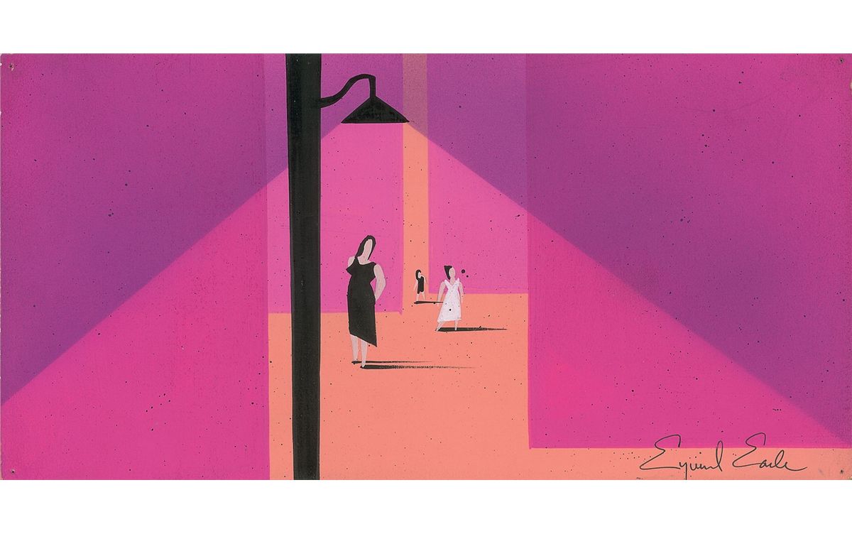 (Mirisch Corp./Seven Arts Productions and released thru United Artists, 1961) Original concept painting by Eyvind Earle from the trailer for West Side Story. Image is done in colorful tempera on a heavy 12 x 6 illustration board, and depicts three women standing between buildings, with a streetlight illuminating the foreground. Signed in the lower right corner in black ink by Earle. In fine condition, with a single tack hole to each corner. Earle created the animated trailer for the film for United Artists through his animation company, Eyvind Earle Productions, shortly after finishing Disney’s Sleeping Beauty. A stylish image for the exciting and colorful trailer for one of the most successful musicals of all time.