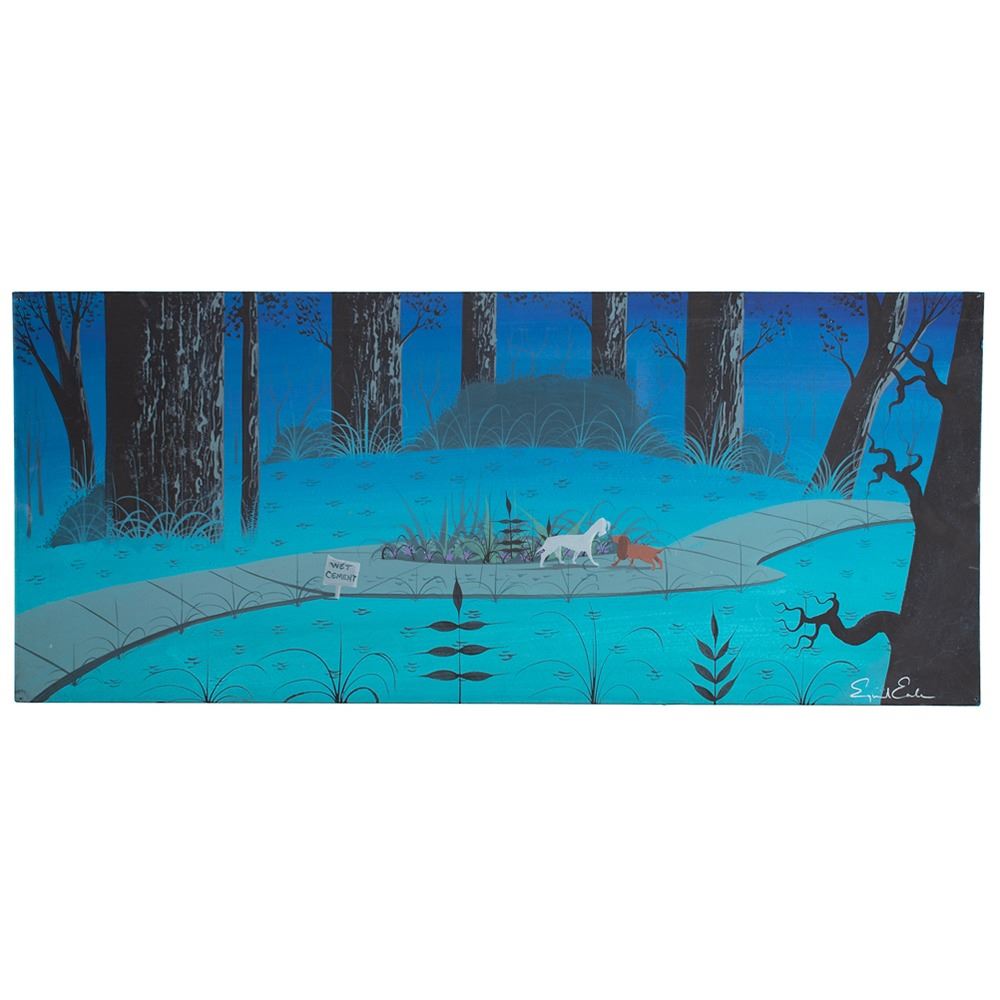 (Walt Disney Studios, 1955) Exquisite original panorama concept storyboard painting by Eyvind Earle from Lady and the Tramp, showing the title canines walking on a park sidewalk during the iconic 'Bella Notte' sequence. In his distinctive style, Earle captures the nighttime scene with a charming sense of secrecy and isolation, centrally placing the dogs to emphasize their growing bond amid a jealous crowd of large trees and ferns. True to the film, Earle adds a touch of humor with the placement of a ‘Wet Cement’ sign and the telltale paw prints left by Lady and Tramp, who then stop at a fresh heart symbol—likewise recently made by a passing couple—before adding to it marks of their own. In the movie, the heart is engraved with ‘JM’ and ‘EB,’ which many believe are the initials for Lady’s owners, Jim and Elizabeth Brown. Accomplished in tempera on 21 x 9 artist's board, signed in the lower right corner in silver graphite by Earle. In fine condition, with tack holes to corners. Disney artist Eyvind Earle, who later became Sleeping Beauty's production designer, created almost 50 miniature concept sketches for the 'Bella Notte' sequence and was a key contributor to the classic film.