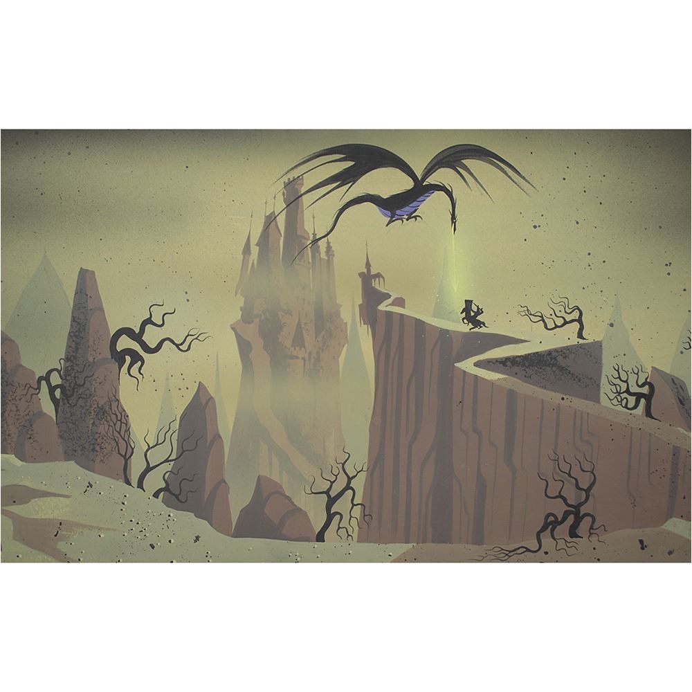 (Walt Disney Studios, 1959) Outstanding original concept storyboard painting by Eyvind Earle for Sleeping Beauty, portraying Prince Phillip and his steed Samson charging into battle against Maleficent, soaring high above as an immense black and purple-bellied dragon. Like many of Earle’s panoramas, he sets the scene from a safe distance, keeping the observer far from harm’s way as he executes the film’s harrowing final conflict—a breathtaking collision of fire and steel, of good versus evil. Maleficent dwarfs the brave horse and knight, riding on a winding, narrow pathway that drops precipitously to either side, as the great winged reptile shoots towards them a stream of bright, wicked flame. The intensity of the action Earle has no doubt mastered, however, nor has he denied us a truly terrible vista, one sparse yet volatile, dominated by a hazy castled backdrop and alive with its cast of jagged rocks and frenzied vines that seem intent on stopping the progress of our heroes. Accomplished in tempera on 24 x 9 artist's board, with Earle signing in black paint in the lower right corner. In fine condition, with tack holes to the corners. Disney artist Eyvind Earle was Sleeping Beauty's production designer, and Disney gave him a significant amount of freedom in designing the settings and selecting colors for the film. Earle also painted the majority of the backgrounds himself, and his stylistic influence is readily apparent in the final product.