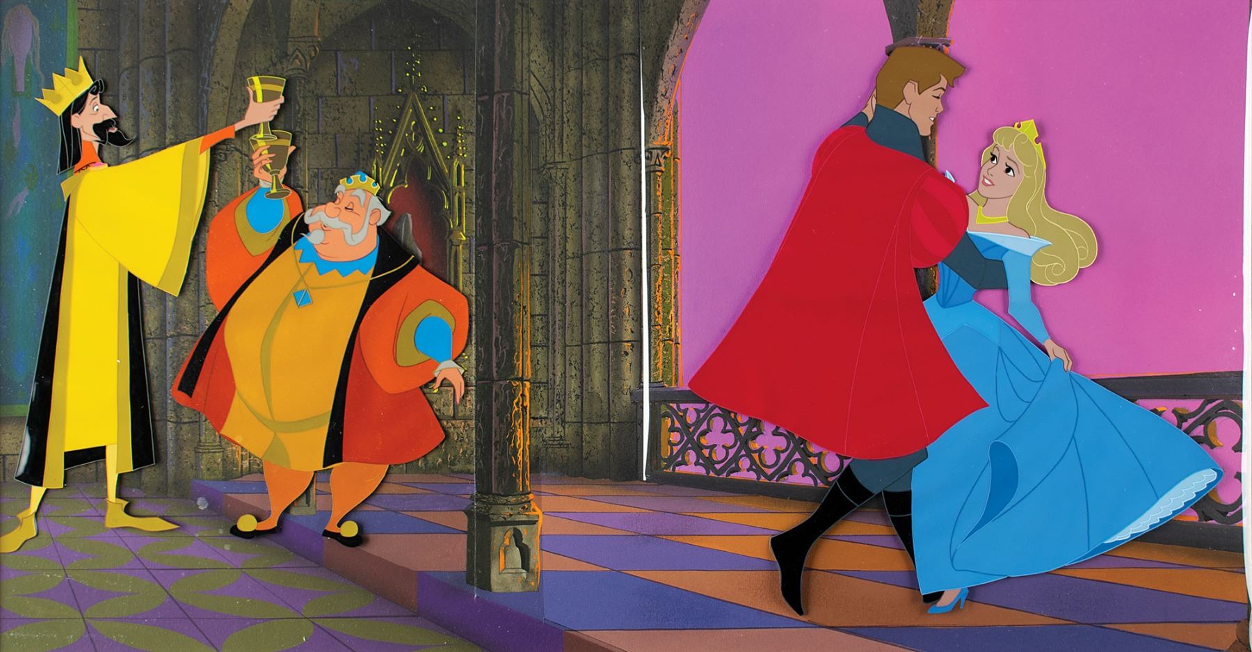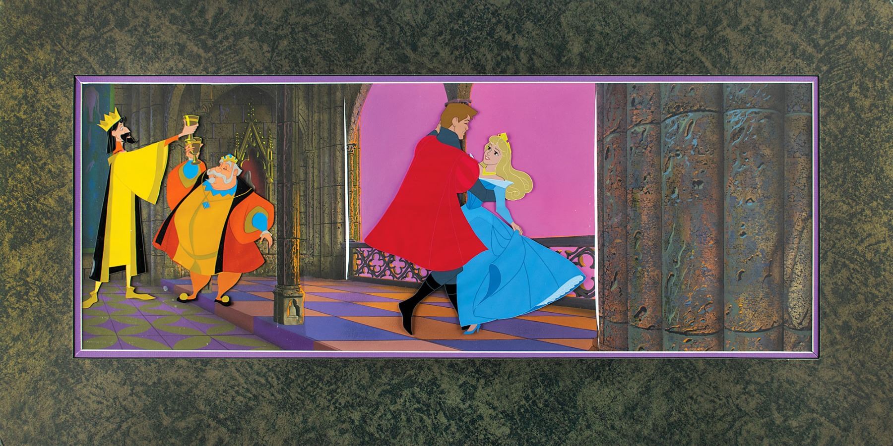 (Walt Disney Studios, 1959) Magnificent original production cels and panoramic background from the Oscar-nominated Disney classic Sleeping Beauty, which is highlighted by a custom prepared background hand-painted by Eyvind Earle. The joyous scene shows Prince Philip and Princess Aurora dancing at the end of the film, with their respective fathers, King Hubert and King Stefan, sharing a toast. The Earle background is strikingly rendered, with impressive detail and color given to all aspects of the hall, in particular to the textured walls, column, and patterned floor. The cels are trimmed to 10 x 11.25 (Philip and Aurora) and 11.5 x 12.5 (kings), with the character images measuring 9 x 9.25 (Philip and Aurora) and 7.75 x 8 (kings); the background measures a remarkable 30.5 x 12.5. Double-matted to an overall size of 36 x 18. In fine condition. Accompanied by a copy of a letter addressed to Earle, who affirms that he did indeed paint the offered Sleeping Beauty background.