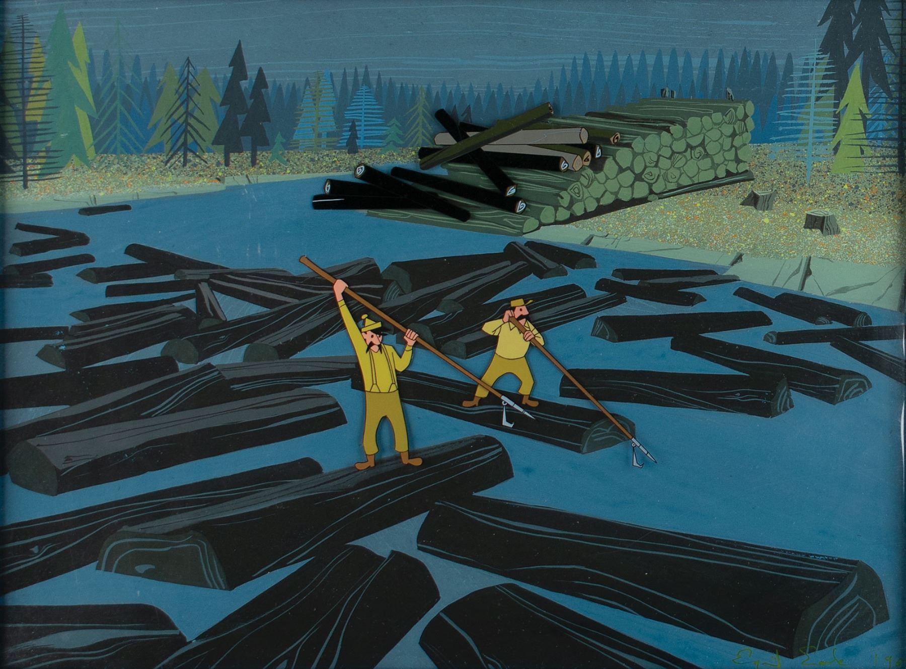(Walt Disney Studios, 1958) Outstanding original production key master background set-up from the Oscar-nominated musical short Paul Bunyan, which is highlighted by a custom prepared background hand-painted by Eyvind Earle, who signs in the lower right corner in green paint. This beautifully rendered scene depicts a pair of lumberjacks maneuvering logs downstream with pike poles during a midwestern log drive. Images measure 6 x 3.5 (Lumberjacks) and 5 x 2 (rolling logs), with the background measuring 15 x 11. Attractively cloth-matted and framed to an overall size of 27 x 23. In fine condition. Consignor notes that the Earle background was signed in person. A magnificent, beautifully realized display piece with background scenery achieved by a true Disney master.
