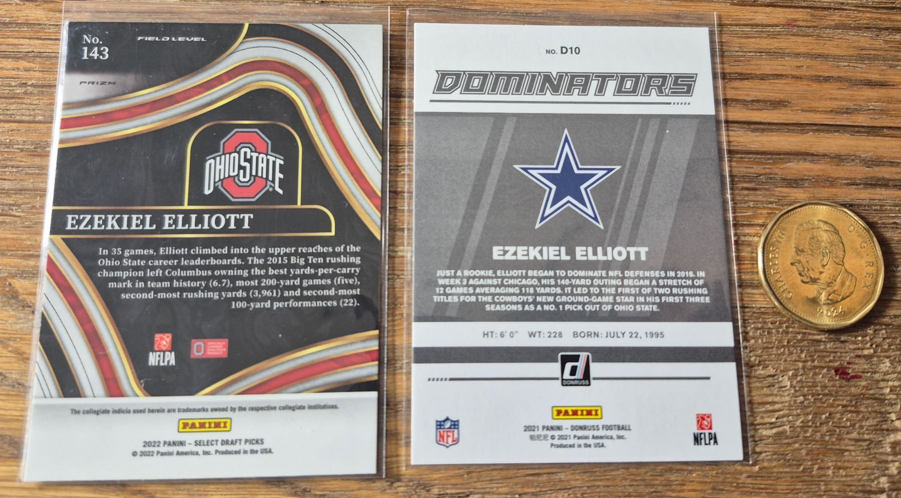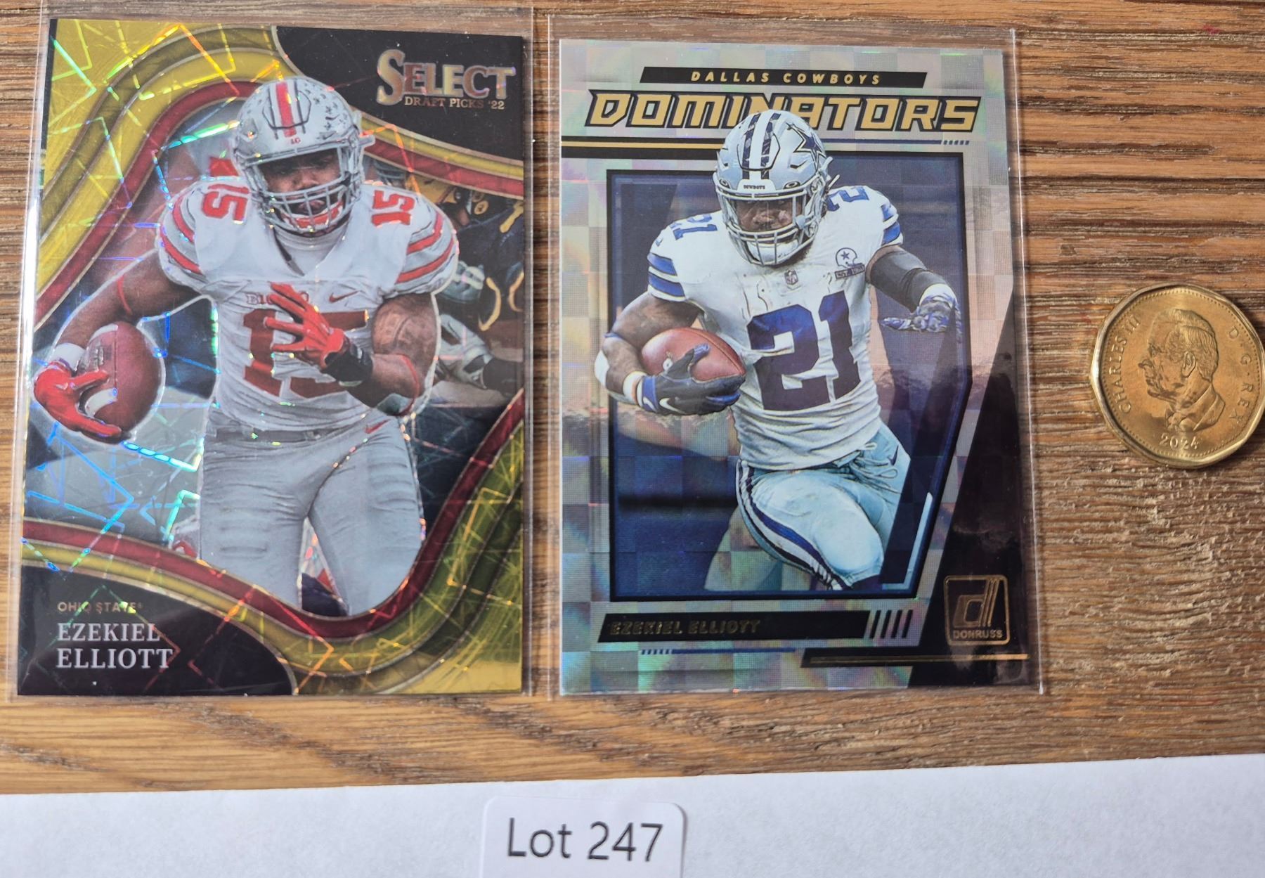 Two-card Ezekiel Elliott lot combining a Select Draft Picks Prizm with a Donruss Dominators insert.