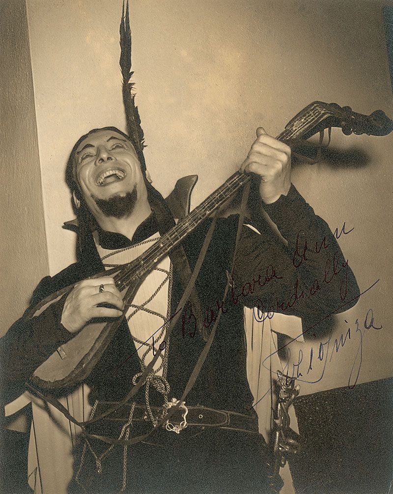 Vintage matte-finish 7.25 x 9 photo of Pinza joyfully rocking out on a lute-type instrument, signed and inscribed in fountain pen, “To Barbara Ann, Cordially, Ezio Pinza.” In fine condition, with moderate contrast to inscription.