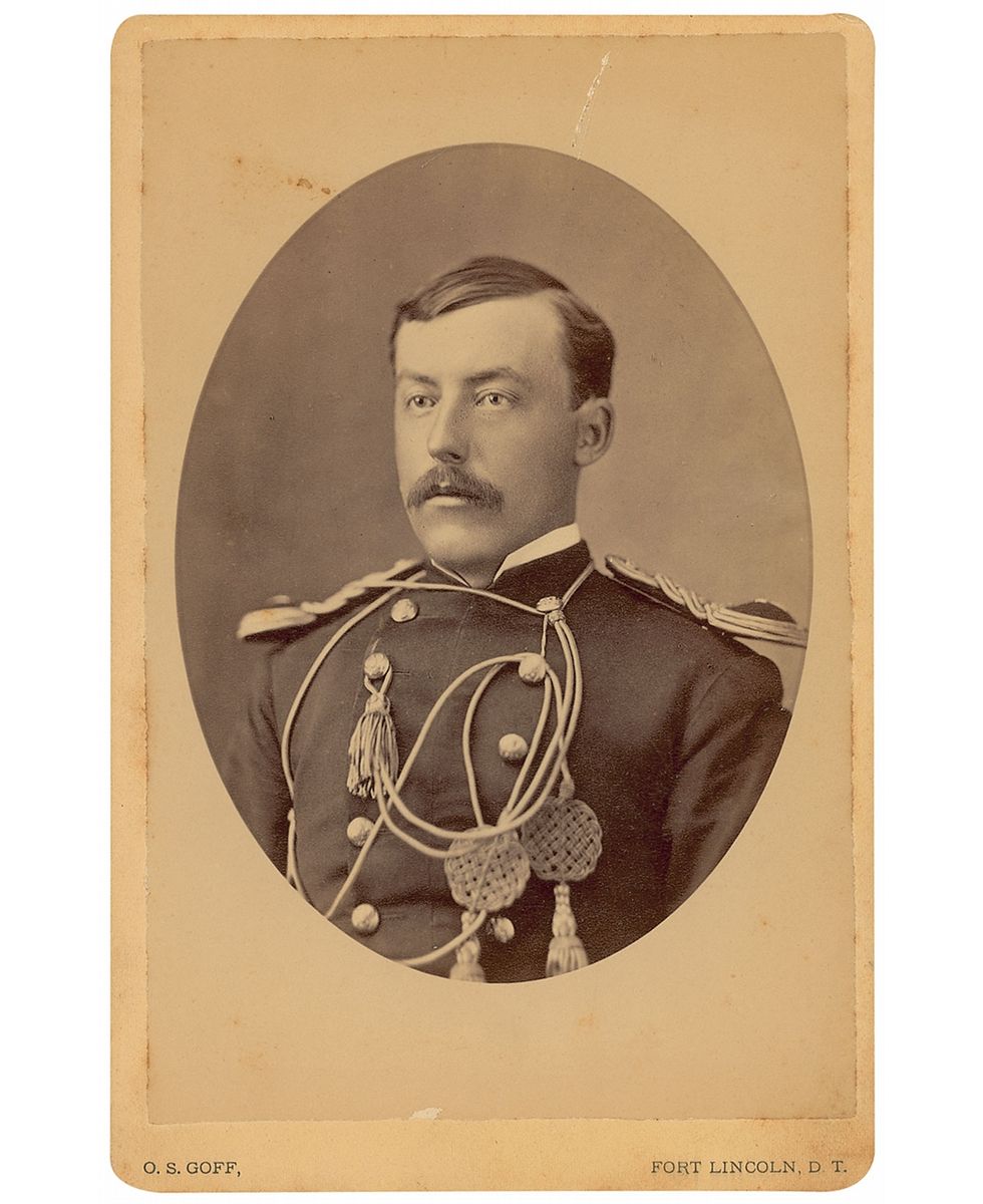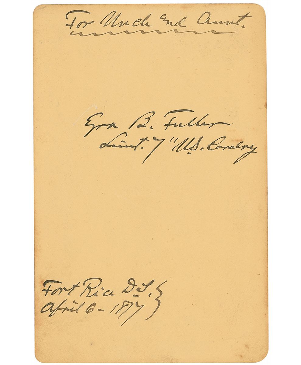 American soldier and cavalry captain. Original 4.25 x 6.5 cabinet photo of Fuller in uniform by O. S. Goff of Fort Lincoln, North Dakota, signed and inscribed on the reverse in black ink, “For Uncle and Aunt, Ezra B. Fuller, Lieut. 7 U. S. Cavalry, Fort Rice, D. T., April 6, 1877.” Light scattered toning and soiling, otherwise fine condition.