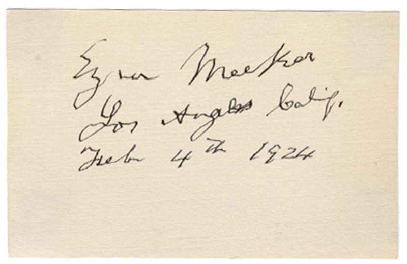 Ezra Meeker ( 1830 - 1928). Early pioneer who traveled the Oregon Trail by ox cart as a young man. Signed Card. "Los Angeles, Calif., Feb. 4th, 1924. "4 3/8" x 2 3/4". "Ezra Meeker, Los Angeles, Calif. Feb. 4th, 1924." Choice.