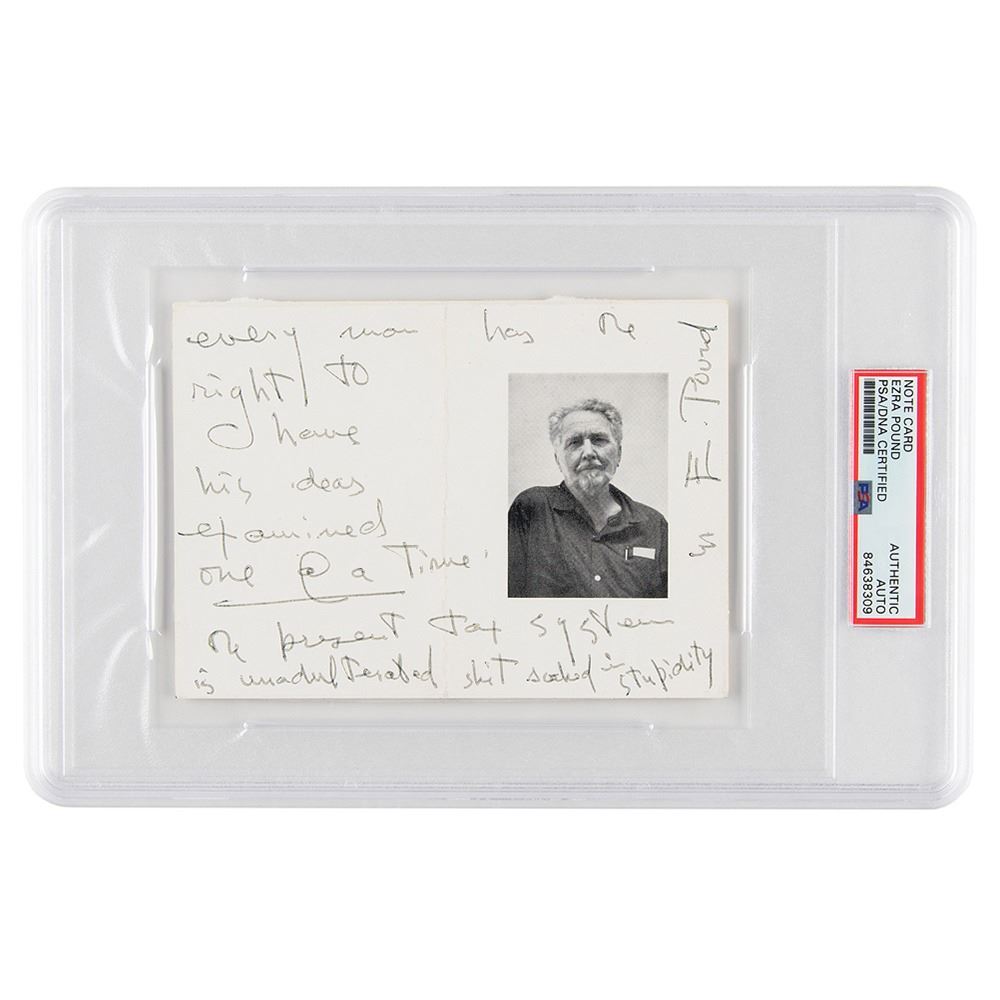 ANS signed “E. Pound,†one page on a 5.75 x 4.25 card imprinted with his portrait, no date. Handwritten note by Ezra Pound, in full: "Every man has the right to have his ideas examined one @ a time. The present tax system is unadulterated shit soaked in stupidity." Reverse bears a few notations in another hand. In very good to fine condition, with a heavy central vertical fold. Encapsulated in a PSA/DNA authentication holder.