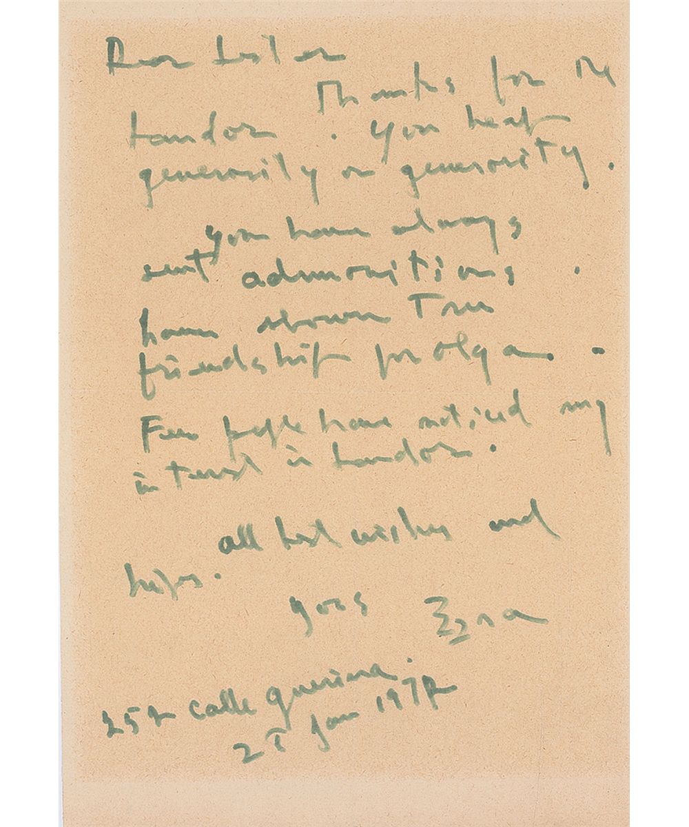 ALS signed “Ezra,” one onionskin page, 7.25 x 10.5, January 21, 1972. Letter to Lester Littlefield. In full: “Thanks for the London. You heap generosity on generosity. You have always sent admonitions, have shown true friendship for Olga. Few people have noticed my interest in London.” Intersecting folds and light overall toning, otherwise fine condition. Littlefield was the Venice tenant of Olga Rudge, Pound’s mistress.